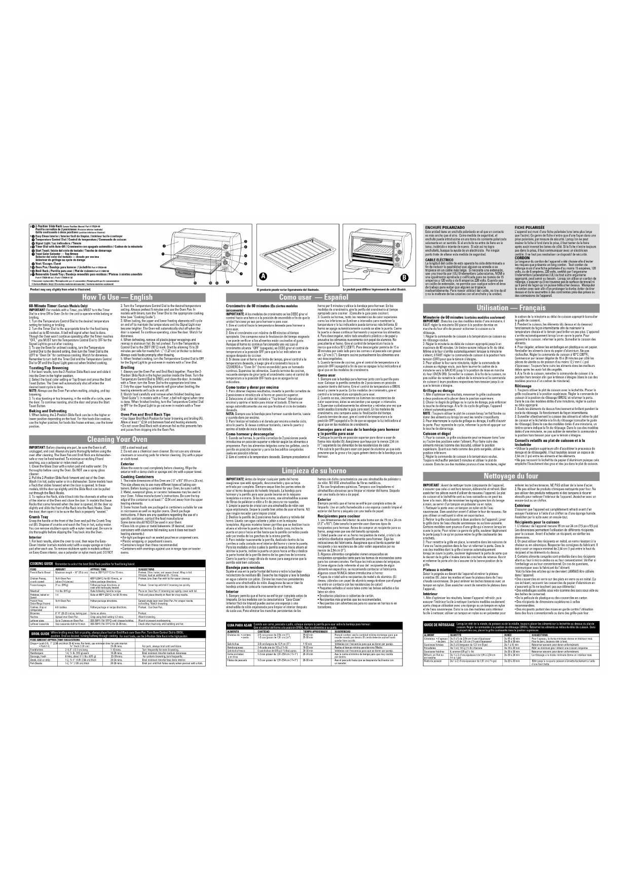 L’appareil est muni d’une fiche polarisée (une lame plus large que l’autre). Ce genre de fiche n’entre que d’une façon dans une prise polarisée, par mesure de sécurité. Lorsqu’on ne peut insérer la fiche à fond dans la prise, il faut tenter de le faire après avoir inversé les lames de côté. Si la fiche n’entre toujours pas dans la prise, il faut communiquer avec un électricien certifié. Il ne faut pas neutraliser ce dispositif de sécurité. CORDON La longueur du cordon de l'appareil a été choisie afin d'éviter les risques que présente un long cordon. Tout cordon de rallonge muni d’une fiche polarisée d’au moins 15 ampères, 120 volts, ou de 6 ampères, 220 volts, certifié par l'organisme Underwriters Laboratories (UL) ou tout autre organisme approprié, peut servir au besoin. Lorsqu'on utilise un cordon de rallonge, s'assurer qu'il ne traverse pas la surface de travail ni qu'il pend de façon qu'on puisse trébucher dessus. Manipuler le cordon avec soin afin d’en prolonger la durée; éviter de tirer dessus et de le soumettre à des contraintes près des prises ou des connexions de l’appareil. IMPORTANTE: Antes de limpiar cualquier parte del horno asegúrese que esté apagado, desconectado y que se haya enfriado por completo. Siempre seque bien las partes antes de usar el horno después de haberlo limpiado. La bandeja para hornear y la parrilla para asar puede lavarse en la máquina lavaplatos o a mano. Si las lava a mano, use almohadillas suaves de fibras de poliéster o nilón a fin de procurar no rayarlas.