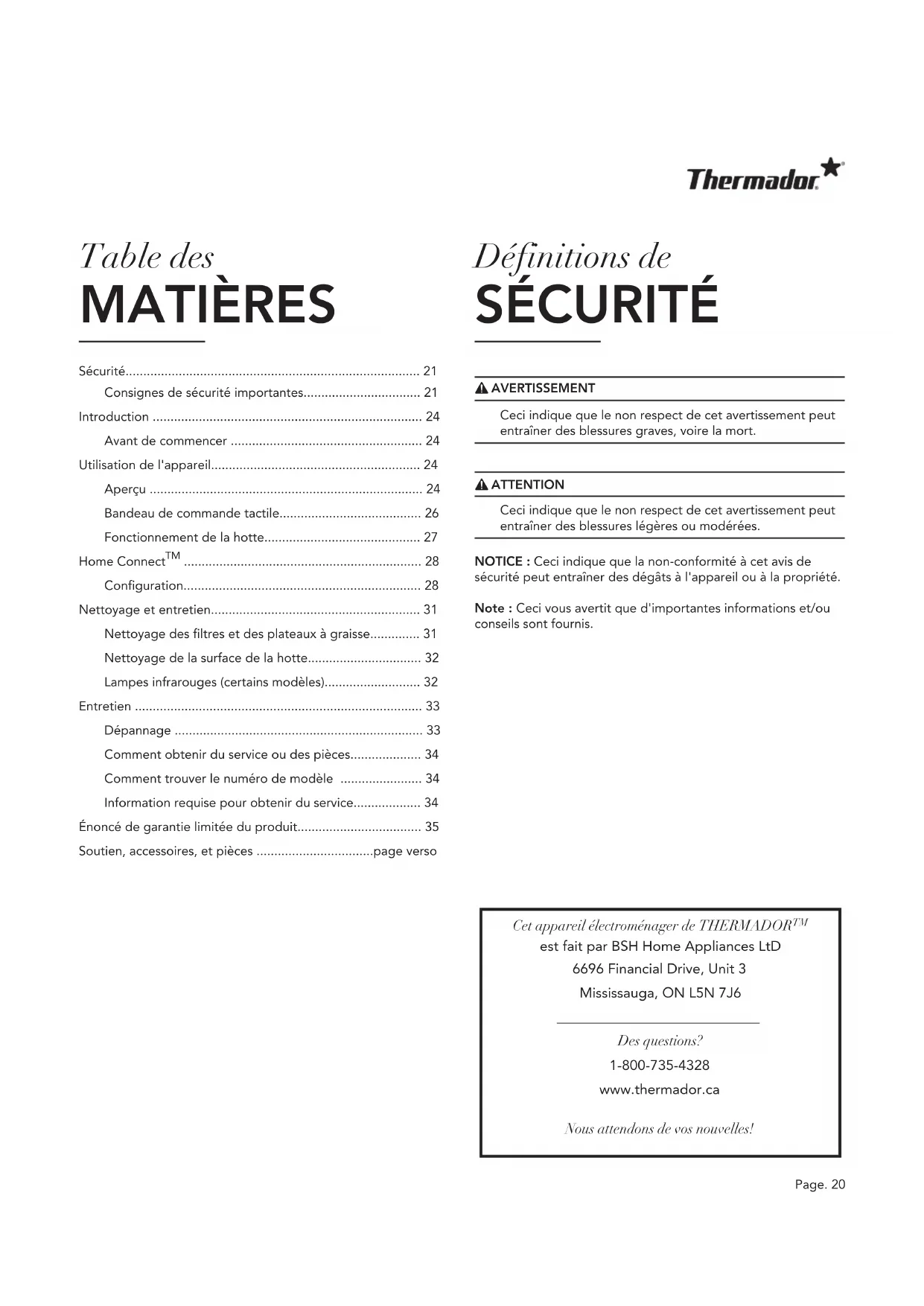 1-800-735-4328.Page. 35 Énoncé de Garantie Limitée du Produit Couverture de la garantie et à qui elle s’applique La garantie limitée offerte par BSH Home Appliances Corporation ("Thermador") dans cet énoncé de garantie limitée du produit ne s’applique qu’à l’appareil Thermador qui vous a été vendu, à titre de premier acheteur, pourvu que le produit ait été acheté :