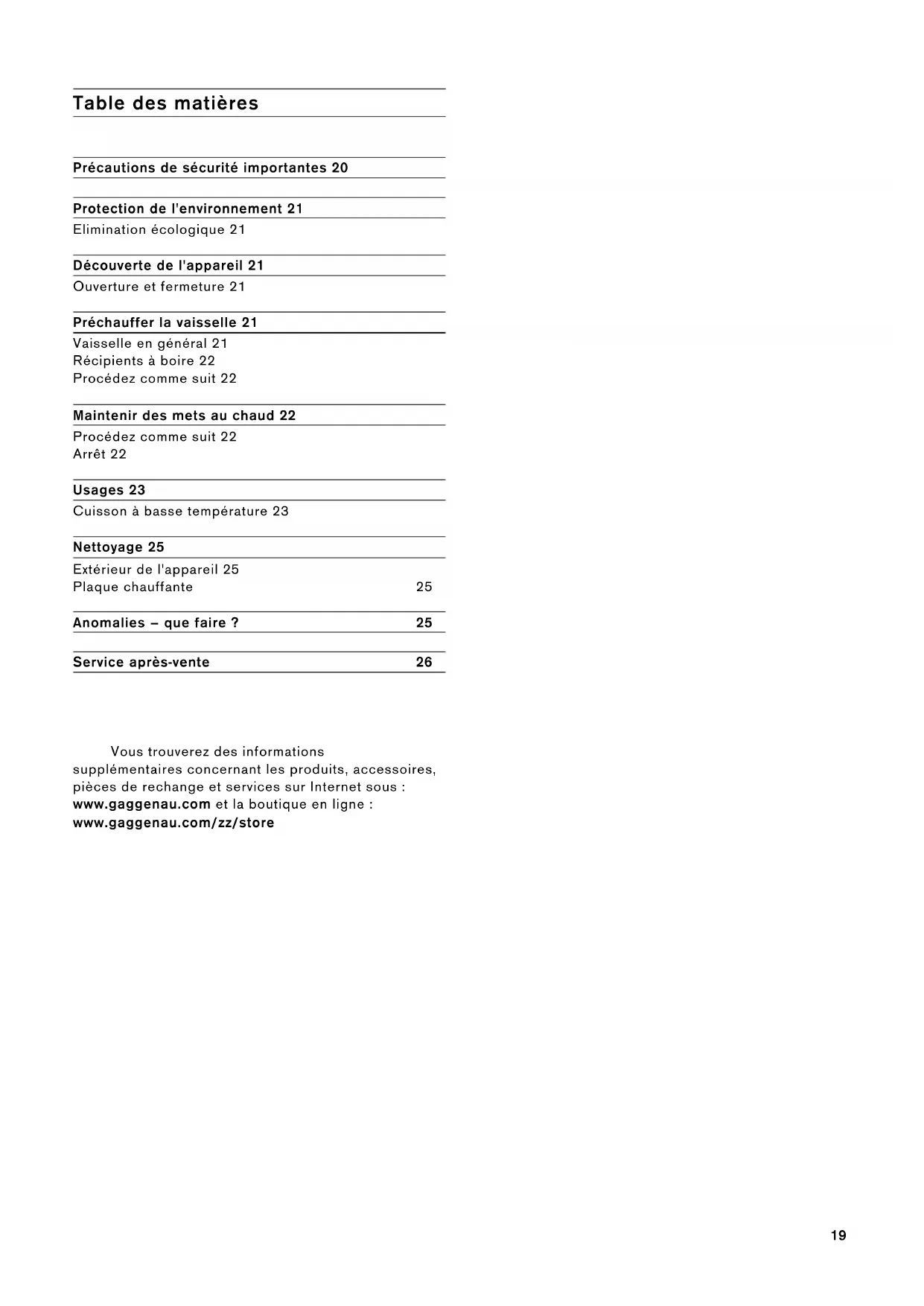 Off peak 0.0088 € per minute. AU 1300 368 339 NZ 09 477 049219 Table des matières Notice d'uti li sati on Précautions de sécurité importantes 20 Protection de l'environnement 21 Elimination écologique 21 Découverte de l'appareil 21 Ouverture et fermeture 21 Préchauffer la vaisselle 21 Vaisselle en général 21 Récipients à boire 22 Procédez comme suit 22 Maintenir des mets au chaud 22 Procédez comme suit 22 Arrêt 22 Usages 23 Cuisson à basse température 23 Nettoyage 25 Extérieur de l'appareil 25 Plaque chauffante 25 Anomalies – que faire ? 25 Service après-vente 26 : Vous trouverez des informations supplémentaires concernant les produits, accessoires, pièces de rechange et services sur Internet sous : www.gaggenau.com et la boutique en ligne : www.gaggenau.com/zz/store20 m Précautions de sécurité importantes Lire attentivement ce manuel. Ce n'est qu'alors que vous pourrez utiliser votre appareil correctement et en toute sécurité. Conserver la notice d'utilisation et de montage pour un usage ultérieur ou pour le propriétaire suivant. Contrôler l'état de l'appareil après l'avoir déballé. Ne pas le raccorder s'il présente des avaries de transport. Cet appareil est destiné exclusivement à une utilisation domestique et non professionnelle. Utiliser l'appareil exclusivement pour maintenir des mets au chaud ou pour chauffer de la vaisselle. Cet appareil est conçu pour une utilisation jusqu'à une altitude maximale de 4 000 m. Cet appareil peut être utilisé par des enfants de 8 ans ou plus et par des personnes dotées de capacités physiques, sensorielles ou mentales réduites ou disposant de connaissances ou d’expérience insuffisantes, sous la surveillance d'un tiers responsable de leur sécurité ou bien lorsqu'ils ont reçu des instructions liées à l'utilisation de l'appareil en toute sécurité et qu'ils ont intégré les risques qui en résultent. Les enfants ne doivent pas jouer avec l'appareil. Le nettoyage et l'entretien effectué par l'utilisateur ne doivent pas être accomplis par des enfants, sauf s'ils sont âgés de 15 ans et plus et qu'un adulte les surveille. Les enfants de moins de 8 ans doivent être tenus à distance de l'appareil et du cordon d'alimentation. Risque de brûlure ! ▯ La plaque chauffante dans le tiroir chauffant devient très chaude. Ne jamais toucher la plaque chauffante. Eloigner les enfants. Risque de brûlure ! ▯ Les récipients ou les accessoires deviennent très chaud. Toujours utiliser des maniques pour retirer le récipient ou les accessoires du compartiment de cuisson. Risque de choc électrique ! ▯ L'isolation des câbles des appareils électroménagers peut fondre au contact des pièces chaudes de l'appareil. Ne jamais mettre le câble de raccordement des appareils électroménagers en contact avec des pièces chaudes de l'appareil. Risque de choc électrique ! ▯ De l'humidité qui pénètre peut occasionner un choc électrique. Ne pas utiliser de nettoyeur haute pression ou de nettoyeur à vapeur. Risque de choc électrique ! ▯ Un appareil défectueux peut provoquer un choc électrique. Ne jamais mettre en service un appareil défectueux. Débrancher la fiche secteur ou enlever le fusible dans le boîtier à fusibles. Appeler le service après-vente. Risque de choc électrique ! ▯ Les fêlures et cassures dans la plaque en verre peuvent occasionner des chocs électriques. Couper le fusible dans la boîte à fusibles. Appeler le service aprèsvente. Risque de choc électrique ! ▯ Les réparations inexpertes sont dangereuses. Seul un technicien du service après-vente formé par nos soins est habilité à effectuer des réparations. Si l'appareil est défectueux, retirer la fiche secteur ou enlever le fusible dans le boîtier à fusibles. Appeler le service aprèsvente. Risque d'incendie ! La plaque chauffante dans le tiroir chauffant devient très chaude, des matières inflammables peuvent s'enflammer. Ne jamais conserver des objets inflammables ou des récipients en plastique dans le tiroir chauffant.21 Protection de l'environnement Elimination écologique Découverte de l'appareil Dans le tiroir de chauffage vous pouvez préchauffer de la vaisselle ou maintenir des aliments au chaud. L'appareil chauffe uniquement si le tiroir est correctement fermé. Ouverture et fermeture En bas de l'appareil il y a un creux qui sert de poignée pour ouvrir et fermer. Lors de l'ouverture et de la fermeture de l'appareil, l'éclairage du compartiment de cuisson est automatiquement activé ou désactivé. Vous pouvez aussi désactiver l'éclairage du compartiment de cuisson de façon permanente. Pour cela, introduisez la main dans le compartiment de cuisson et éteignez l'éclairage en haut à gauche. Préchauffer la vaisselle Les mets refroidissent moins vite dans une vaisselle préchauffée. Les boissons restent plus longtemps chaudes. Vaisselle en général Vous pouvez charger le tiroir de chauffage d'un poids maximal de 25 kg. Vous pouvez p.ex. préchauffer de la vaisselle de table pour 6 à 12 personnes. Eliminez l'emballage en respectant l'environnement. Cet appareil est marqué selon la directive européenne 2012/19/UE relative aux appareils électriques et électroniques usagés (waste electrical and electronic equipment - WEEE). La directive définit le cadre pour une reprise et une récupération des appareils usagés applicables dans les pays de la CE. (FODLUDJHGXFRPSDUWLPHQWGHFXLVVRQ 3ODTXHGHFKDXIIDJH 9HQWLODWHXUHWFKDXIIDJH GpPDUUHQWORUVGHODSRVLWLRQ 3UpFKDXIIDJHGHYDLVVHOOH 7pPRLQGHVHUYLFH /RUVTXHYRXVDOOXPH]ODSSDUHLO