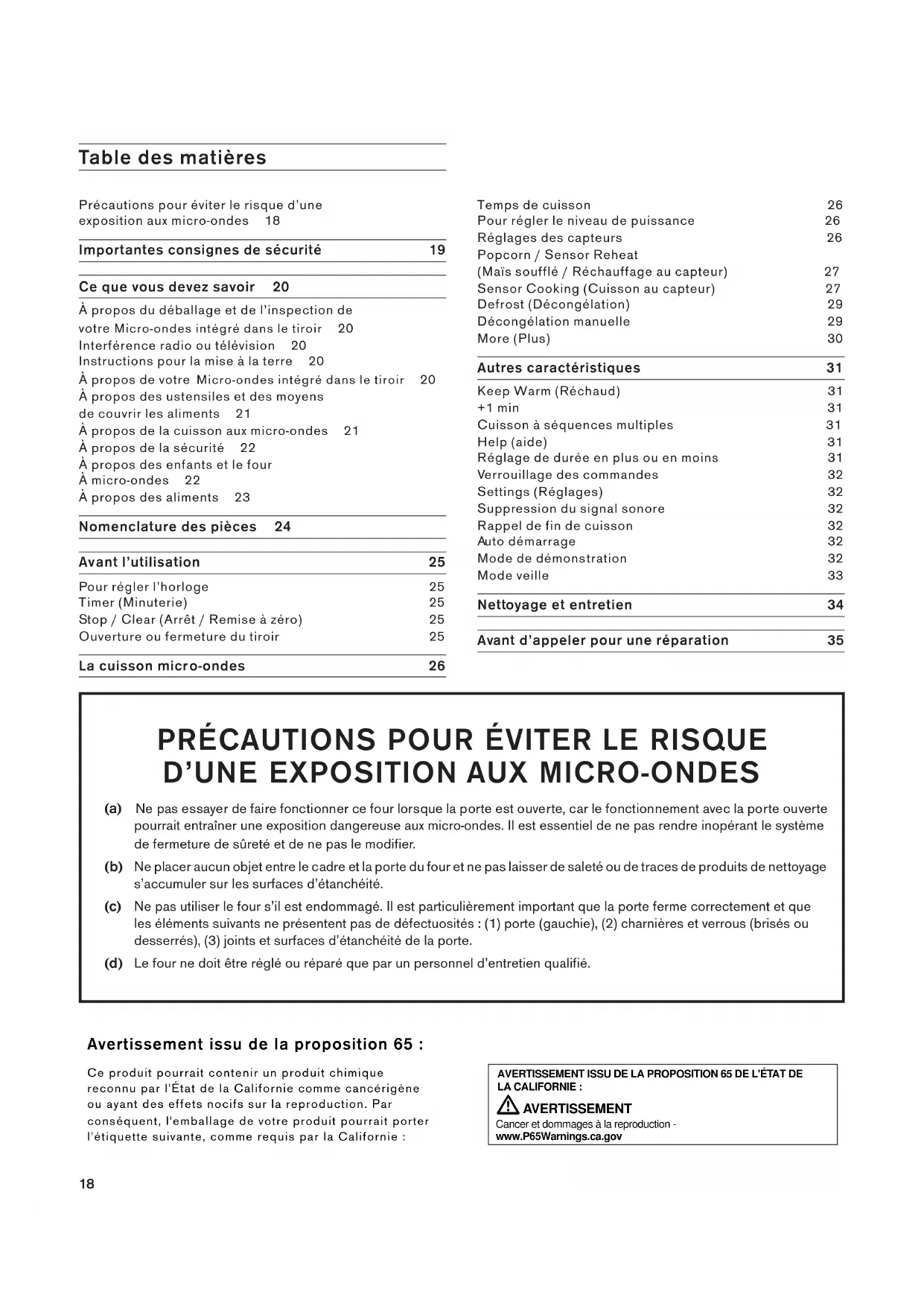 (a) Ne pas essayer de faire fonctionner ce four lorsque la porte est ouverte, car le fonctionnement avec la porte ouverte pourrait entraîner une exposition dangereuse aux micro-ondes. Il est essentiel de ne pas rendre inopérant le système de fermeture de sûreté et de ne pas le modifier. (b) Ne placer aucun objet entre le cadre et la porte du four et ne pas laisser de saleté ou de traces de produits de nettoyage s’accumuler sur les surfaces d’étanchéité. (c) Ne pas utiliser le four s’il est endommagé. Il est particulièrement important que la porte ferme correctement et que les éléments suivants ne présentent pas de défectuosités : (1) porte (gauchie), (2) charnières et verrous (brisés ou desserrés), (3) joints et surfaces d’étanchéité de la porte. (d) Le four ne doit être réglé ou réparé que par un personnel d’entretien qualifié. Avertissement issu de la proposition 65 : Ce produit pourrait contenir un produit chimique reconnu par l'État de la Californie comme cancérigène ou ayant des effets nocifs sur la reproduction. Par conséquent, l'emballage de votre produit pourrait porter l'étiquette suivante, comme requis par la Californie : &DQFHUHWGRPPDJHVjODUHSURGXFWLRQZZZ3:DUQLQJVFDJRY$9(57,66(0(17$9(57,66(0(17,668'(/$352326,7,21â'(/e7$7'(/$&$/,)251,(â19 IMportanteS conSIGneS De SÉcurItÉ