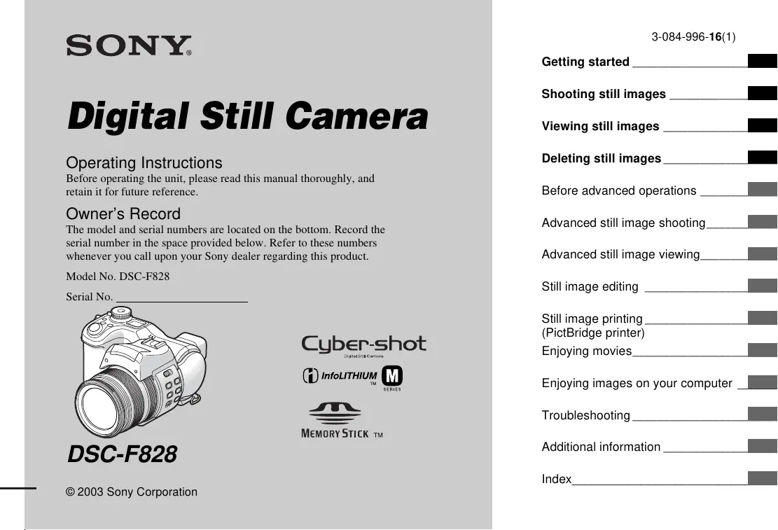 Retrouvez gratuitement la notice de l'appareil CYBER-SHOT DSC-F828 SONY au format PDF.
