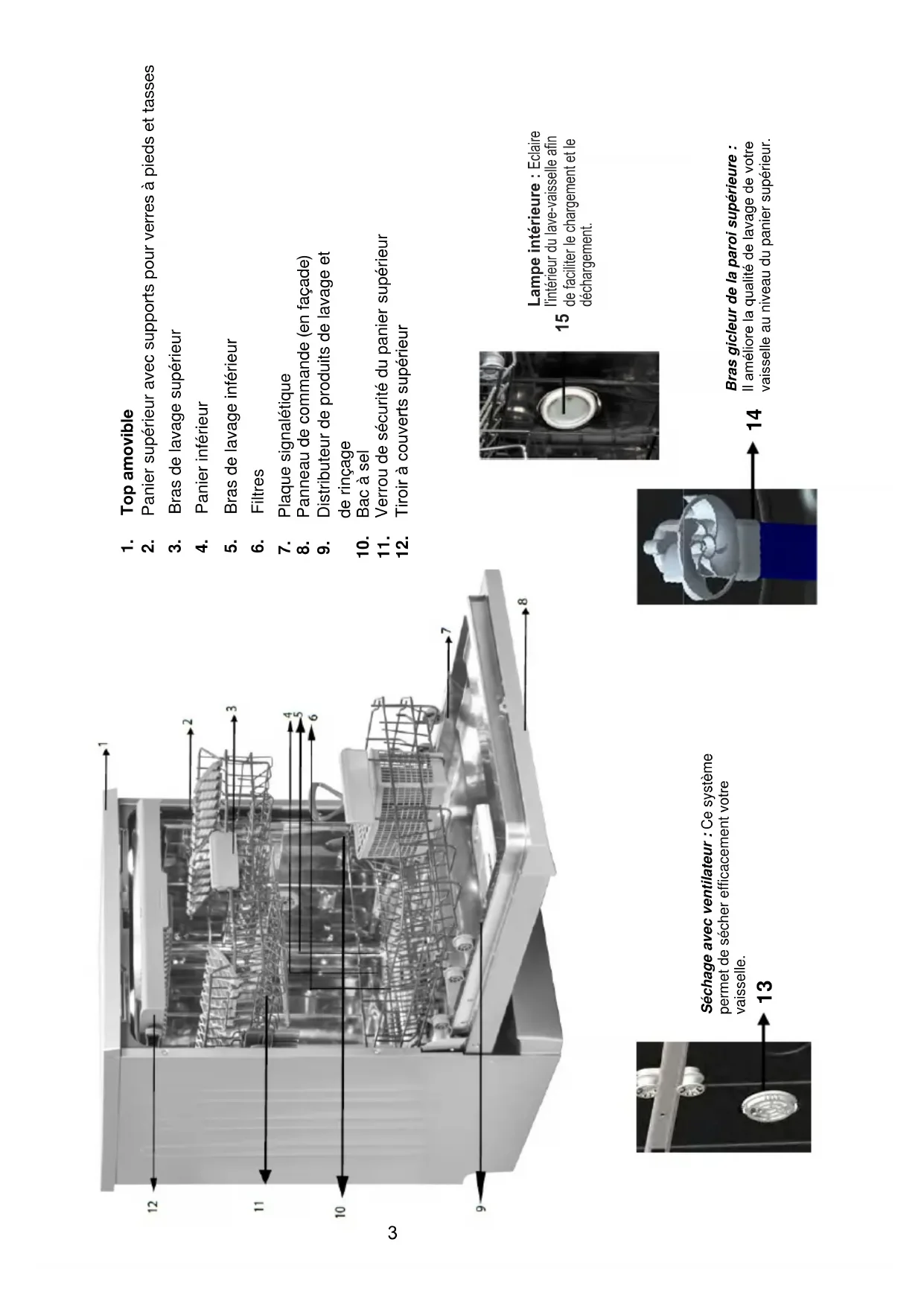 Bras gicleur de la paroi supérieure : Il améliore la qualité de lavage de votre vaisselle au niveau du panier supérieur. Séchage avec ventilateur : Ce système permet de sécher efficacement votrevaisselle. Lampe intérieure : Eclaire l'intérieur du lave-vaisselle afin de faciliter le chargement et le déchargement.