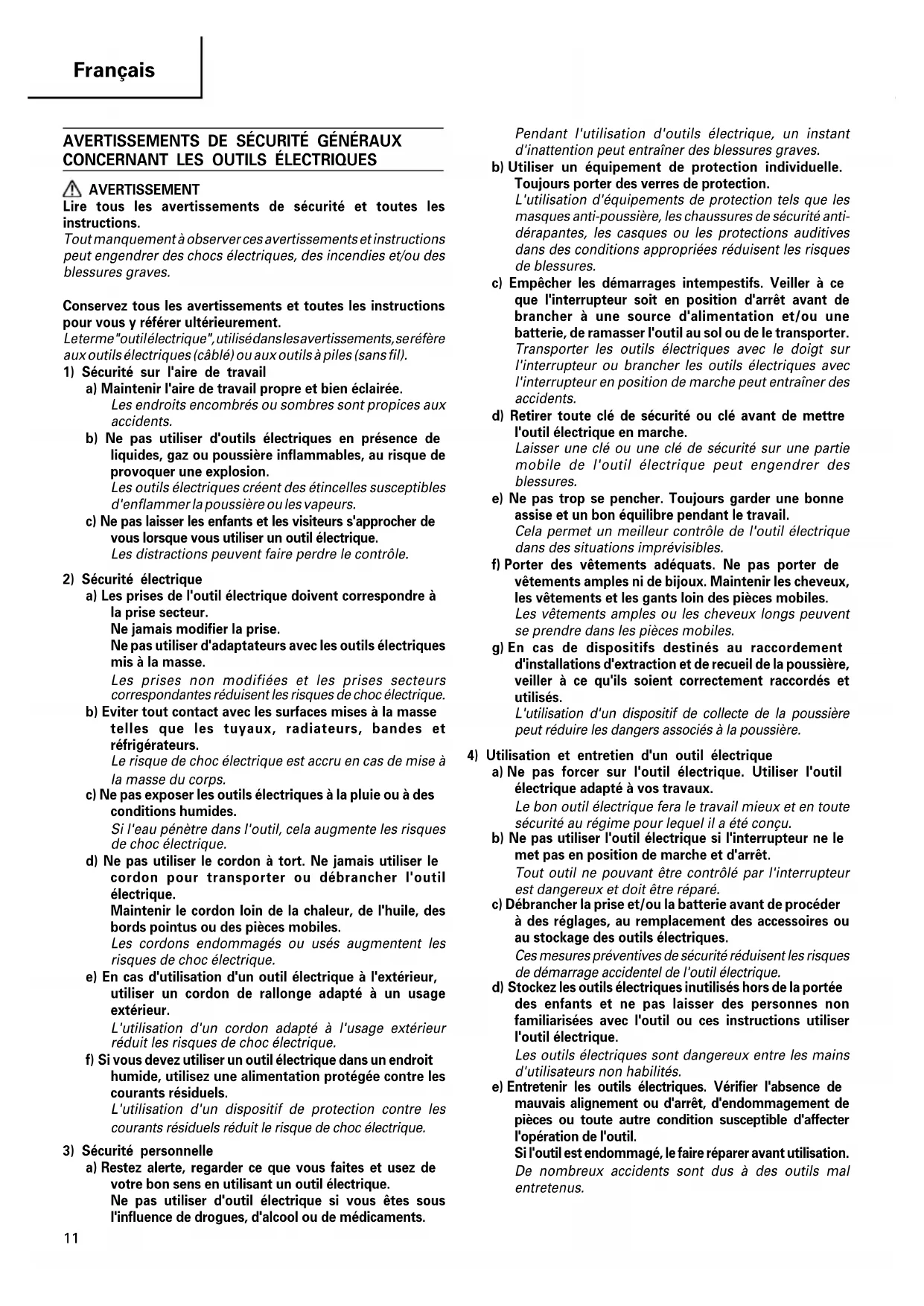 AVERTISSEMENT Lire tous les avertissements de sécurité et toutes les instructions. Tout manquement à observer ces avertissements et instructions peut engendrer des chocs électriques, des incendies et/ou des blessures graves. Conservez tous les avertissements et toutes les instructions pour vous y référer ultérieurement. Le terme "outil électrique", utilisé dans les avertissements, se réfère aux outils électriques (câblé) ou aux outils à piles (sans fil).