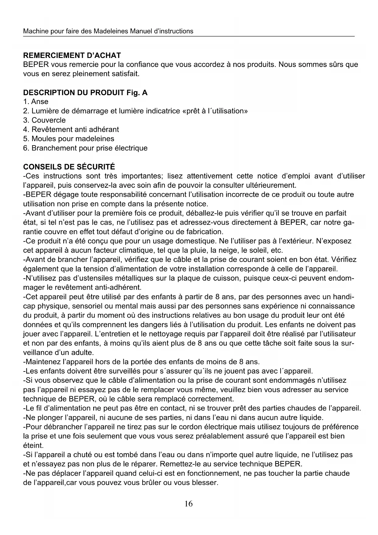 -Ces instructions sont très importantes; lisez attentivement cette notice d’emploi avant d’utiliser l’appareil, puis conservez-la avec soin an de pouvoir la consulter ultérieurement. -BEPER dégage toute responsabilité concernant l’utilisation incorrecte de ce produit ou toute autre utilisation non prise en compte dans la présente notice. -Avant d’utiliser pour la première fois ce produit, déballez-le puis vérier qu’il se trouve en parfait état, si tel n’est pas le cas, ne l’utilisez pas et adressez-vous directement à BEPER, car notre ga- rantie couvre en effet tout défaut d’origine ou de fabrication. -Ce produit n’a été conçu que pour un usage domestique. Ne l’utiliser pas à l’extérieur. N’exposez cet appareil à aucun facteur climatique, tel que la pluie, la neige, le soleil, etc. -Avant de brancher l’appareil, vériez que le câble et la prise de courant soient en bon état. Vériez également que la tension d’alimentation de votre installation corresponde à celle de l’appareil. -N’utilisez pas d’ustensiles métalliques sur la plaque de cuisson, puisque ceux-ci peuvent endom- mager le revêtement anti-adhérent. -Cet appareil peut être utilisé par des enfants à partir de 8 ans, par des personnes avec un handi- cap physique, sensoriel ou mental mais aussi par des personnes sans expérience ni connaissance du produit, à partir du moment où des instructions relatives au bon usage du produit leur ont été données et qu’ils comprennent les dangers liés à l’utilisation du produit. Les enfants ne doivent pas jouer avec l’appareil. L’entretien et le nettoyage requis par l’appareil doit être réalisé par l’utilisateur et non par des enfants, à moins qu’ils aient plus de 8 ans ou que cette tâche soit faite sous la sur- veillance d’un adulte. -Maintenez l’appareil hors de la portée des enfants de moins de 8 ans. -Les enfants doivent être surveillés pour s´assurer qu´ils ne jouent pas avec l´appareil. -Si vous observez que le câble d’alimentation ou la prise de courant sont endommagés n’utilisez pas l’appareil ni essayez pas de le remplacer vous même, veuillez bien vous adresser au service technique de BEPER, où le câble sera remplacé correctement. -Le l d’alimentation ne peut pas être en contact, ni se trouver prêt des parties chaudes de l’appareil. -Ne plonger l’appareil, ni aucune de ses parties, ni dans l’eau ni dans aucun autre liquide. -Pour débrancher l’appareil ne tirez pas sur le cordon électrique mais utilisez toujours de préférence la prise et une fois seulement que vous vous serez préalablement assuré que l’appareil est bien éteint. -Si l’appareil a chuté ou est tombé dans l’eau ou dans n’importe quel autre liquide, ne l’utilisez pas et n’essayez pas non plus de le réparer. Remettez-le au service technique BEPER. -Ne pas déplacer l’appareil quand celui-ci est en fonctionnement, ne pas toucher la partie chaude de l’appareil,car vous pouvez vous brûler ou vous blesser.FRANÇAIS Machine pour faire des Madeleines Manuel d’instructions