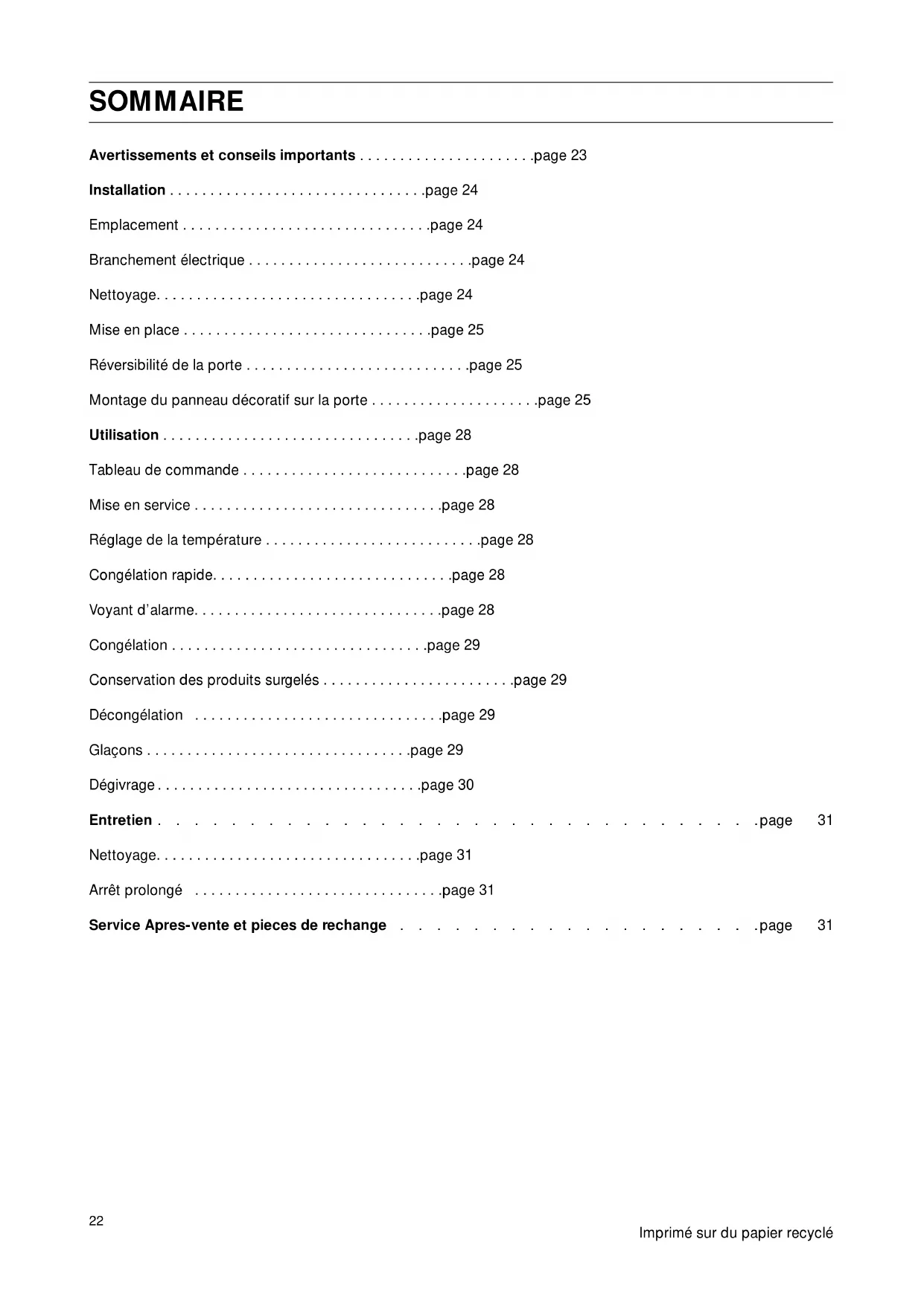 2222 320-1222 SOMMAIRE Avertissements et conseils importants ...page 23 Installation ...page 24 Emplacement ...page 24 Branchement électrique ...page 24 Nettoyage...page 24 Mise en place ...page 25 Réversibilité de la porte ...page 25 Montage du panneau décoratif sur la porte ...page 25 Utilisation ...page 28 Tableau de commande ...page 28 Mise en service ...page 28 Réglage de la température ...page 28 Congélation rapide...page 28 Voyant d’alarme...page 28 Congélation ...page 29 Conservation des produits surgelés ...page 29 Décongélation ...page 29 Glaçons ...page 29 Dégivrage ...page 30 Entretien ...page 31 Nettoyage...page 31 Arrêt prolongé ...page 31 Service Apres-vente et pieces de rechange ...page 31 Imprimé sur du papier recyclé23