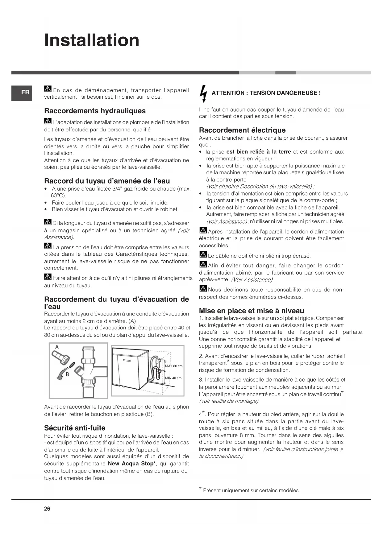 La pression de l’eau doit être comprise entre les valeurs citées dans le tableau des Caractéristiques techniques, autrement le lave-vaisselle risque de ne pas fonctionner correctement.Faireattentionàcequ'iln'yaitnipliuresniétranglementsau niveau du tuyau. Raccordement du tuyau d’évacuation de l’eau Raccorder le tuyau d’évacuation à une conduite d’évacuation ayantaumoins2cmdediamètre.(A)Leraccorddutuyaud’évacuationdoitêtreplacéentre40et80 cm au-dessus du sol ou du plan d’appui du lave-vaisselle.Avant de raccorder le tuyau d’évacuation de l’eau au siphon del’évier,retirerlebouchonenplastique(B). Sécurité anti-fuite Pour éviter tout risque d’inondation, le lave-vaisselle :- est équipé d’un dispositif qui coupe l’arrivée de l’eau en cas d’anomalie ou de fuite à l’intérieur de l’appareil.Quelques modèles sont aussi équipés d’un dispositif de sécurité supplémentaire New Acqua Stop*, qui garantit contretoutrisqued'inondationmêmeencasderupturedutuyau d’amenée de l’eau. ATTENTION : TENSION DANGEREUSE ! Il ne faut en aucun cas couper le tuyau d’amenée de l’eau car il contient des parties sous tension. Raccordement électrique Avantdebrancherlafichedanslaprisedecourant,s'assurerque :