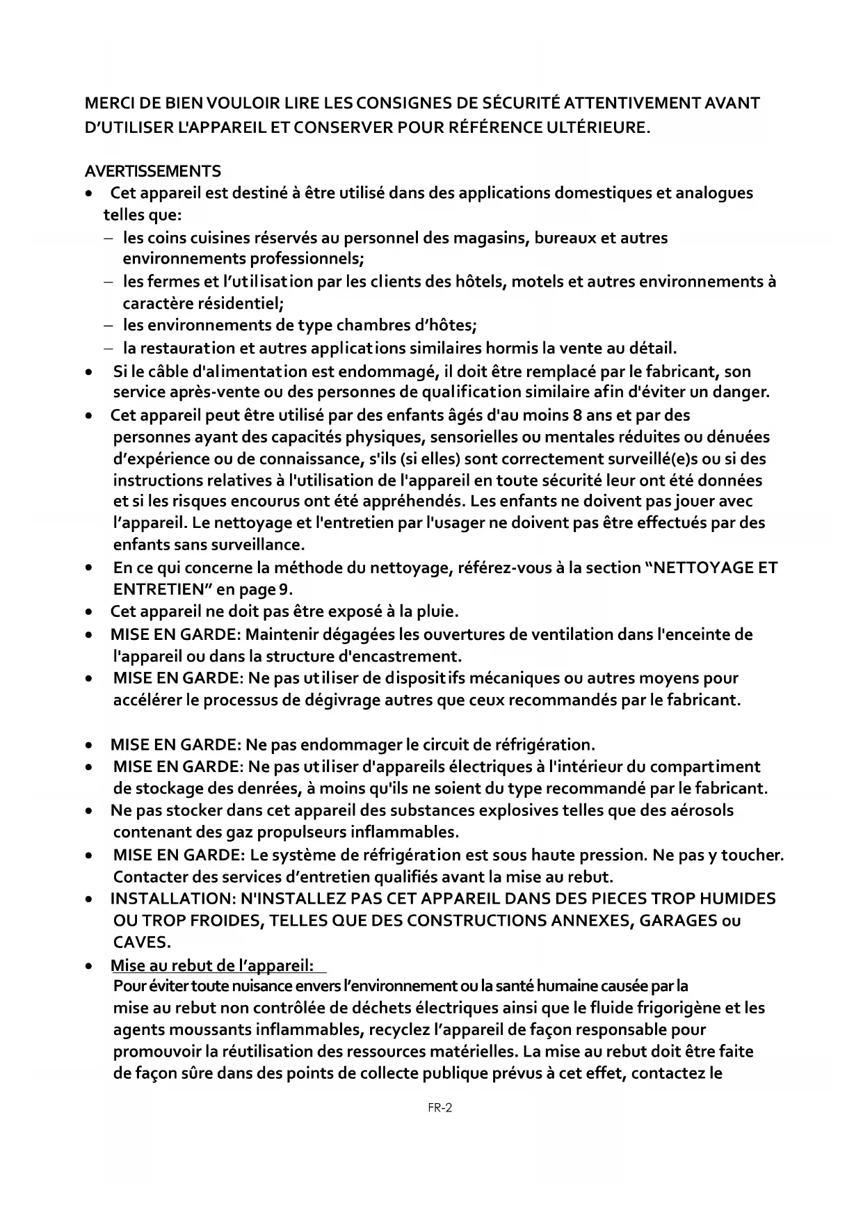 - Mise au rebut de l’appareil: Pour éviter toute nuisance envers l’environnement ou la santé humaine causée par la mise au rebut non contrôlée de déchets électriques ainsi que le fluide frigorigène et les agents moussants inflammables, recyclez l’appareil de façon responsable pour promouvoir la réutilisation des ressources matérielles. La mise au rebut doit être faite de façon sûre dans des points de collecte publique prévus à cet effet, contactez leFR-3 centre de traitement des déchets le plus près de chez vous pour plus de détails sur les procédures correctes de mise au rebut.