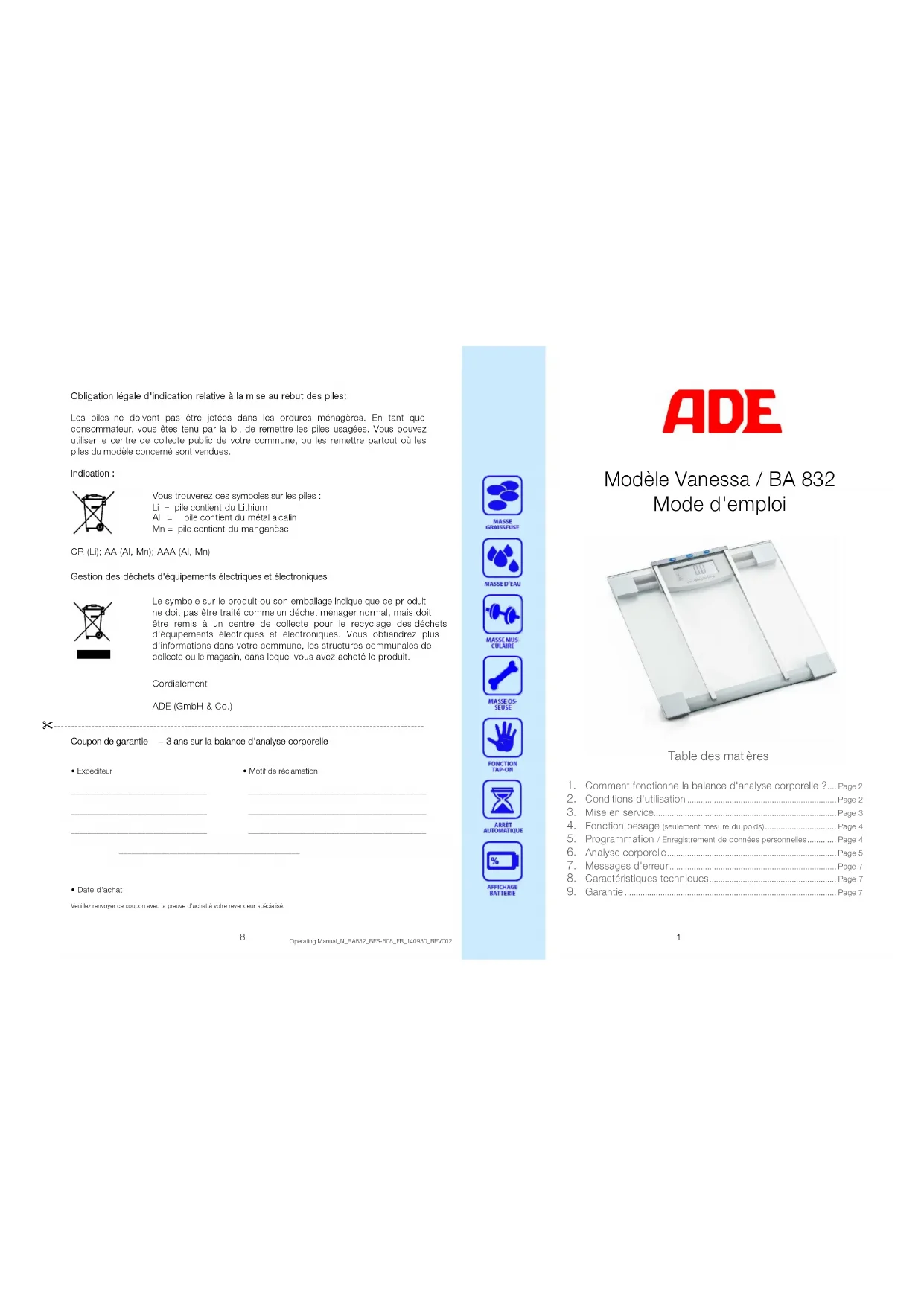 Vanessa BA 832 - Balance ADE - Notice d'utilisation et mode d'emploi gratuit