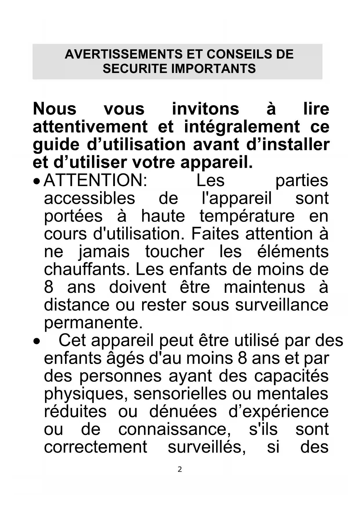 - ATTENTION: Les parties accessibles de l'appareil sont portées à haute température en cours d'utilisation. Faites attention à ne jamais toucher les éléments chauffants. Les enfants de moins de 8 ans doivent être maintenus à distance ou rester sous surveillance permanente.