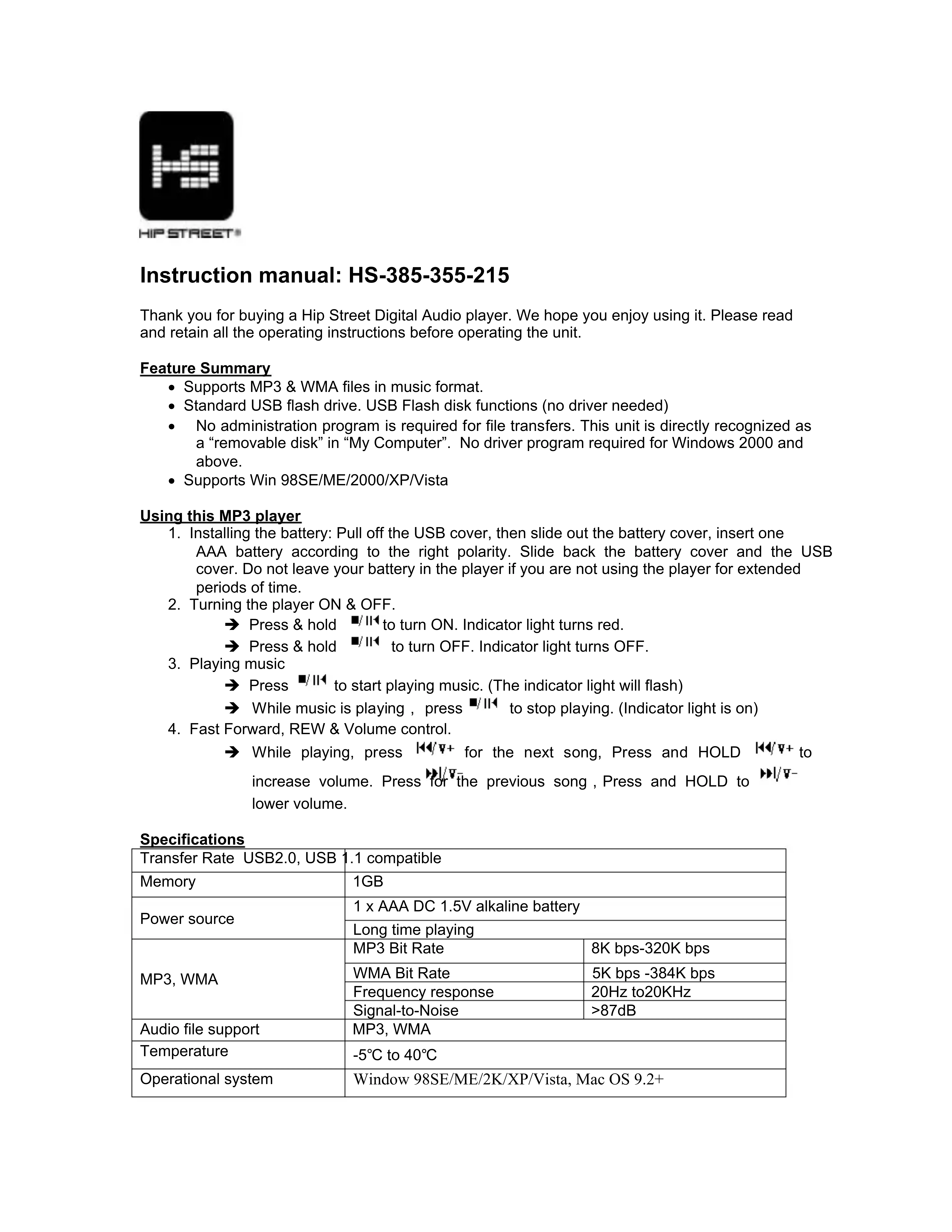 HS355 - Lecteur mp3 Hipstreet - Notice d'utilisation et mode d'emploi gratuit