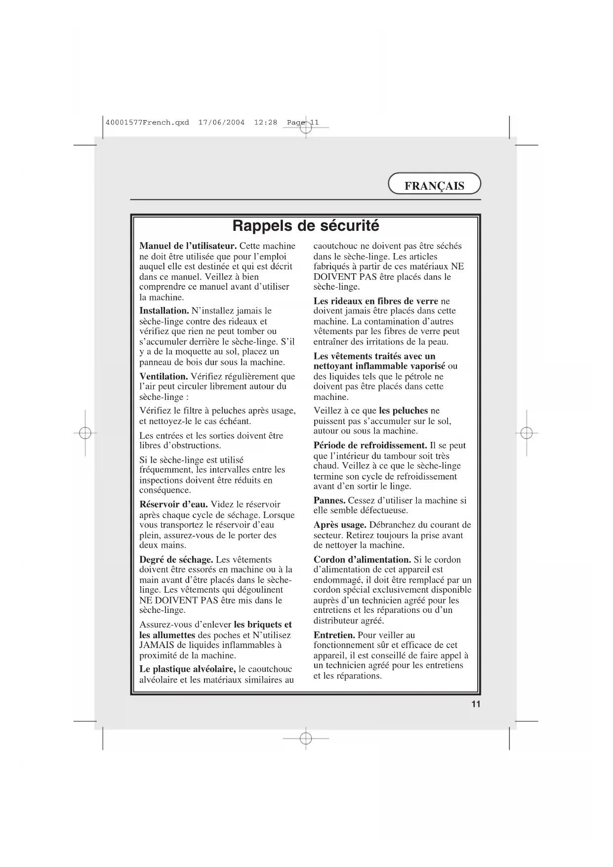Rappels de sécurité Manuel de l’utilisateur. Cette machine ne doit être utilisée que pour l’emploi auquel elle est destinée et qui est décrit dans ce manuel. Veillez à bien comprendre ce manuel avant d’utiliser la machine. Installation. N’installez jamais le sèche-linge contre des rideaux et vérifiez que rien ne peut tomber ou s’accumuler derrière le sèche-linge. S’il y a de la moquette au sol, placez un panneau de bois dur sous la machine. Ventilation. Vérifiez régulièrement que l’air peut circuler librement autour du sèche-linge : Vérifiez le filtre à peluches après usage, et nettoyez-le le cas échéant. Les entrées et les sorties doivent être libres d’obstructions. Si le sèche-linge est utilisé fréquemment, les intervalles entre les inspections doivent être réduits en conséquence. Réservoir d’eau. Videz le réservoir après chaque cycle de séchage. Lorsque vous transportez le réservoir d’eau plein, assurez-vous de le porter des deux mains. Degré de séchage. Les vêtements doivent être essorés en machine ou à la main avant d’être placés dans le sèche- linge. Les vêtements qui dégoulinent NE DOIVENT PAS être mis dans le sèche-linge. Assurez-vous d’enlever les briquets et les allumettes des poches et N’utilisez JAMAIS de liquides inflammables à proximité de la machine. Le plastique alvéolaire, le caoutchouc alvéolaire et les matériaux similaires au caoutchouc ne doivent pas être séchés dans le sèche-linge. Les articles fabriqués à partir de ces matériaux NE DOIVENT PAS être placés dans le sèche-linge. Les rideaux en fibres de verre ne doivent jamais être placés dans cette machine. La contamination d’autres vêtements par les fibres de verre peut entraîner des irritations de la peau. Les vêtements traités avec un nettoyant inflammable vaporisé ou des liquides tels que le pétrole ne doivent pas être placés dans cette machine. Veillez à ce que les peluches ne puissent pas s’accumuler sur le sol, autour ou sous la machine. Période de refroidissement. Il se peut que l’intérieur du tambour soit très chaud. Veillez à ce que le sèche-linge termine son cycle de refroidissement avant d’en sortir le linge. Pannes. Cessez d’utiliser la machine si elle semble défectueuse. Après usage. Débranchez du courant de secteur. Retirez toujours la prise avant de nettoyer la machine. Cordon d’alimentation. Si le cordon d’alimentation de cet appareil est endommagé, il doit être remplacé par un cordon spécial exclusivement disponible auprès d’un technicien agréé pour les entretiens et les réparations ou d’un distributeur agréé. Entretien. Pour veiller au fonctionnement sûr et efficace de cet appareil, il est conseillé de faire appel à un technicien agréé pour les entretiens et les réparations. 40001577French.qxd 17/06/2004 12:28 Page 11Rappels de sécurité 11 Besoins électriques 12 Besoins d’installation 13 Préparation de la charge 13 Préparation des vêtements 13 Poids de séchage maximum 13 Tri de la charge 13-14 Ne séchez pas en machine 14 Economies d’énergie 14 Ouverture de la porte 14 Filtre 14 Réservoir d’eau 15 Condenseur 15 Guide de séchage 16 Commandes et indicateurs 17 Fonctionnement 18 Nettoyage du sèche-linge 19 Spécification technique 19 Dépistage de pannes 20 Avant d’utiliser le sèche-linge pour la première fois : ● veuillez lire ce manuel d’instruction en détail. ● retirez tous les articles qui se trouvent à l’intérieur du tambour. ● essuyez l’intérieur du tambour et de la porte avec un chiffon humide pour éliminer la poussière éventuelle qui aurait pu s’y infiltrer en transit. IMPORTANT : Ce sèche-linge doit être utilisé exclusivement pour sécher le linge de maison et les vêtements qui ont été nettoyés avec une solution aqueuse. NE séchez PAS les tissus secs qui ont été traités avec des liquides de nettoyage à sec. Besoins électriques Cet appareil est équipé d’une fiche moulée qu’il est impossible de recâbler. La fiche doit être accessible pour débrancher l’appareil une fois qu’il a été installé. IMPORTANT : Les fils du câble de secteur sont codés par couleur, comme suit : Bleu - NEUTRE Marron - SOUS TENSION Vert et jaune - TERRE Si le cordon d’alimentation de cet appareil est endommagé, il doit être remplacé par un cordon spécial exclusivement disponible auprès d’un technicien agréé pour les entretiens et les réparations ou d’un distributeur agréé.