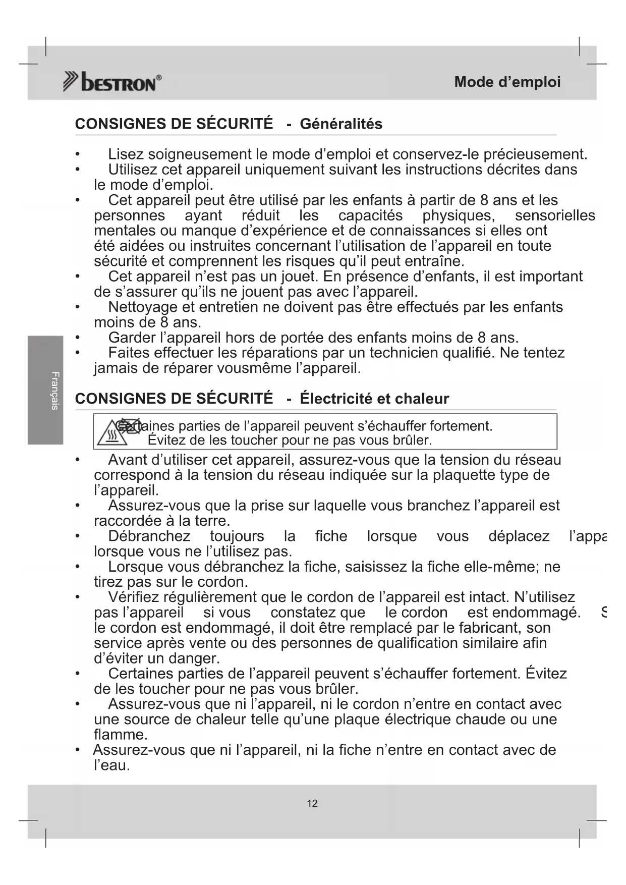 - Faiteseffectuerlesréparationsparuntechnicienqualifié.Netentez jamaisderéparervousmêmel’appareil. CONSIGNES DE SÉCURITÉ - Électricité et chaleur