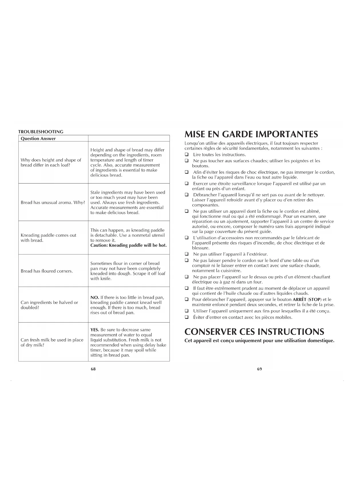 DÉPANNAGE Question Réponse Pourquoi la hauteur et la forme du pain change-t-elle d’une miche à l’autre? La hauteur et la taille du pain peuvent changer en fonction des ingrédients, de la température ambiante et de la longueur du cycle. De plus, le dosage précis des ingrédients est essentiel à la préparation d’un excellent pain. Le pain a un arôme inhabituel. Pourquoi? Il est possible que des ingrédients périmés aient été utilisés ou que la pâte comporte trop de levure. Toujours utiliser des ingrédients frais. Le dosage précis des ingrédients est essentiel à la préparation d’un excellent pain. Le disque de malaxage reste accroché au pain lors du démoulage. Cela est susceptible d’arriver, car le disque de malaxage est amovible. Utiliser un ustensile non métallique pour le séparer du pain. Attention : Le disque de malaxage sera chaud. Le pain a de la farine dans les coins. Parfois, la farine dans les coins du moule n’est pas complètement pétrie avec le reste de la pâte. La racler de la miche à l’aide d’un couteau. La quantité des ingrédients peut-elle être divisée en deux ou doublée? NON. Si le moule à pain n’est pas assez rempli, le disque de malaxage ne pourra pas pétrir la pâte correctement. S’il est trop rempli, le pain sortira du moule en levant. Est-il possible d’utiliser du lait frais à la place du lait en poudre? OUI. Retirer cependant une quantité d’eau équivalente. Le lait frais n’est pas idéal pour la minuterie à retardateur de cuisson, car il risque de tourner pendant qu’il repose dans le moule à pain. Entretien et nettoyage L’utilisateur ne peut effectuer lui-même l’entretien d’aucune pièce de ce produit. Coner l’entretien à un technicien qualié. NETTOYAGE Important : Toujours débrancher la machine à pain et la laisser refroidir complètement avant de la nettoyer. Le moule à pain et le disque de malaxage ont des surfaces antiadhésives, ce qui rend le nettoyage de l’appareil plus facile.