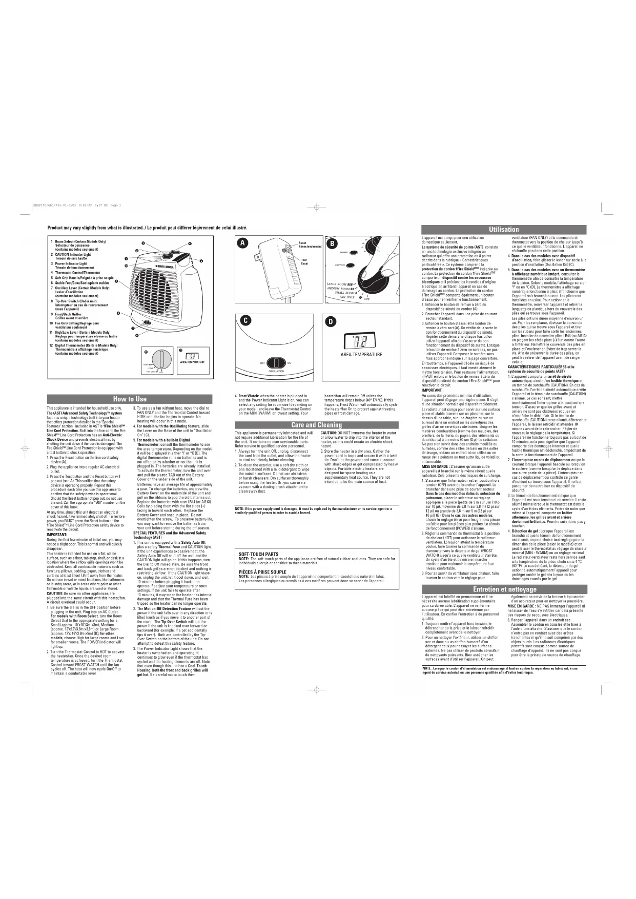 à affichage numérique intégré, consulter le thermomètre afin de connaître la température de la pièce. Selon le modèle, l’affichage sera en °F ou en °C (D). Le thermomètre à affichage numérique fonctionne à piles; il fonctionne que l’appareil soit branché ou non. Les piles sont installées en usine. Pour actionner le thermomètre, renverser l’appareil et retirer la languette de plastique hors du couvercle des piles qui se trouve sous l’appareil. Les piles ont une durée moyenne d’environ un an. Pour les remplacer, dévisser le couvercle des piles qui se trouve sous l’appareil et tirer sur les rubans pour faire sortir les anciennes piles. Installer de nouvelles piles LR44 (ou AG13) en plaçant les côtés plats (+) l’un contre l’autre à l’intérieur. Remettre le couvercle des piles en place et l’enclencher. Éviter de trop serrer la vis. Afin de préserver la durée des piles, on peut les retirer de l’appareil avant de ranger celui-ci. CARACTÉRISTIQUES PARTICULIÈRES et le système de sécurité de pointe (AST)
