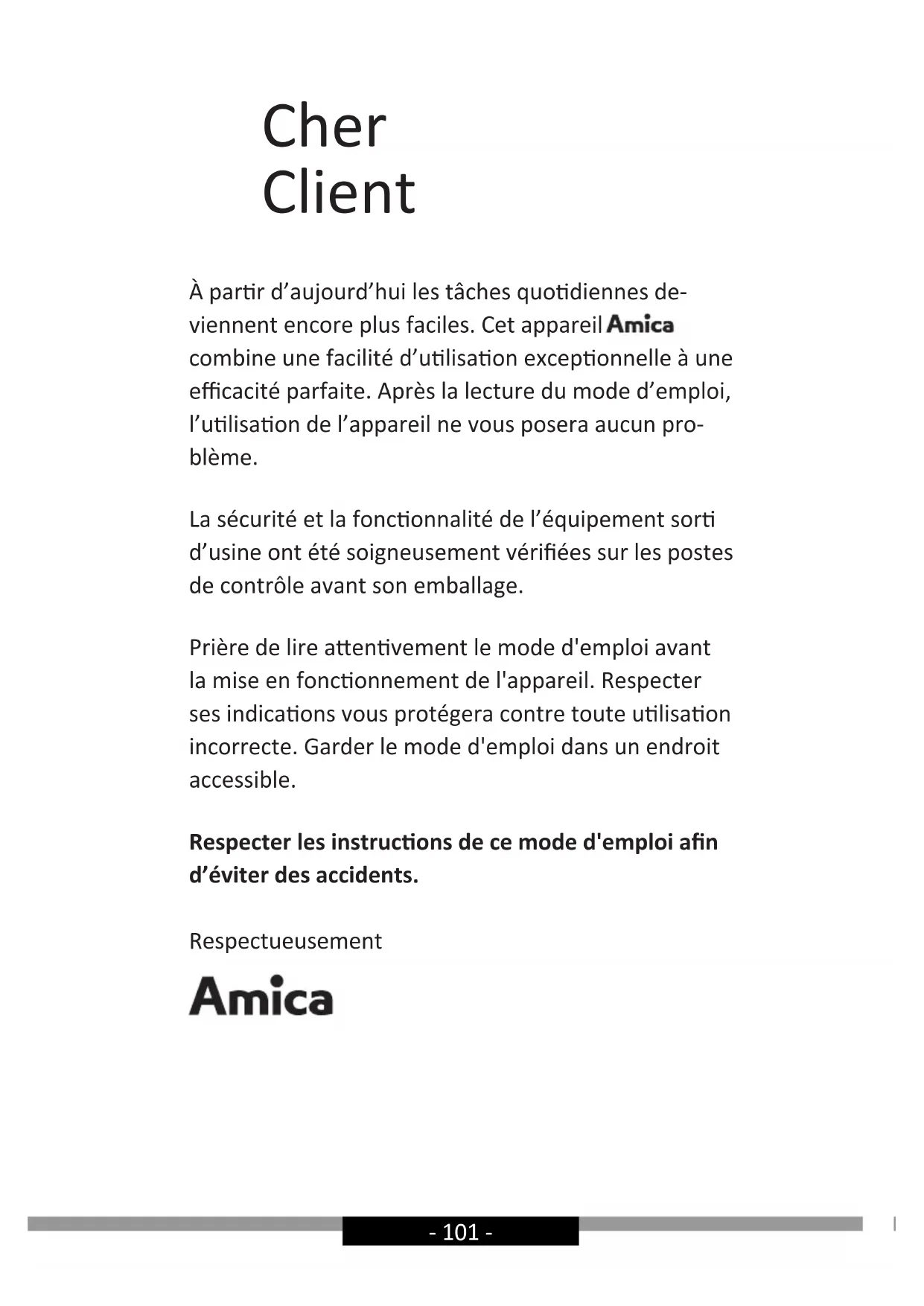 - smernica pre nízke napätie 2014/35/EC• smernica elektromagnetickej kompatibility 2014/30/EC• smernica ErP - 2009/125/EC• smernica RoHS 2011/65/EC a preto výrobok získal označenie a bolo preň vydané Vyhlásenie o zhode, a toto vyhlásenie bolo sprístupnené orgánom obchodnej inšpekcie.- 101 - Cher Client À parr d’aujourd’hui les tâches quodiennes de- viennent encore plus faciles. Cet appareil combine une facilité d’ulisaon exceponnelle à une ecacité parfaite. Après la lecture du mode d’emploi, l’ulisaon de l’appareil ne vous posera aucun pro- blème. La sécurité et la fonconnalité de l’équipement sor d’usine ont été soigneusement vériées sur les postes de contrôle avant son emballage. Prière de lire aenvement le mode d'emploi avant la mise en fonconnement de l'appareil. Respecter ses indicaons vous protégera contre toute ulisaon incorrecte. Garder le mode d'emploi dans un endroit accessible. Respecter les instrucons de ce mode d'emploi an d’éviter des accidents. Respectueusement- 102 -