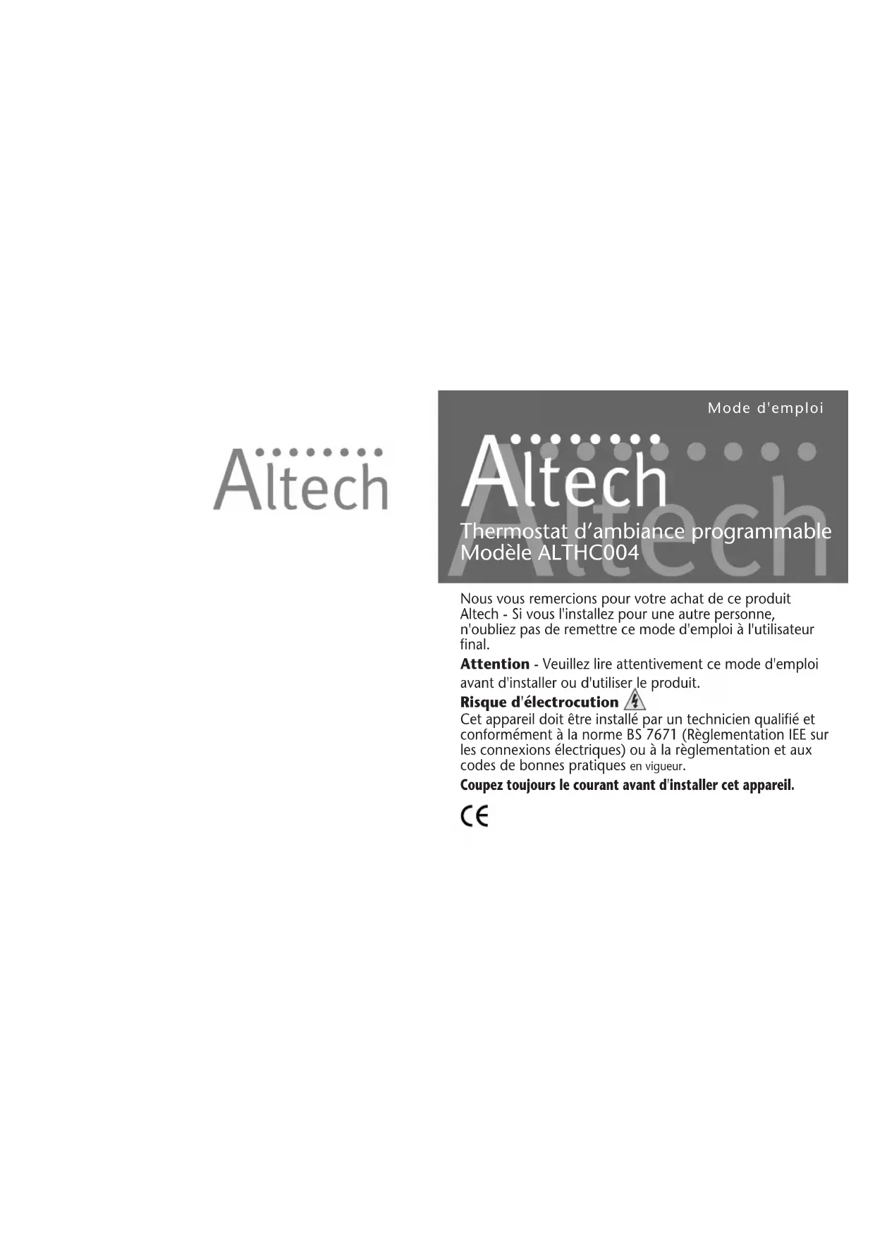Mode d'emploi Thermostat d’ambiance programmable Modèle ALTHC004 Nous vous remercions pour votre achat de ce produit Altech - Si vous l'installez pour une autre personne, n'oubliez pas de remettre ce mode d'emploi à l'utilisateur final. Attention - Veuillez lire attentivement ce mode d'emploi avant d'installer ou d'utiliser le produit. Risque d'électrocution Cet appareil doit être installé par un technicien qualifié et conformément à la norme BS 7671 (Règlementation IEE sur les connexions électriques) ou à la règlementation et aux codes de bonnes pratiques en vigueur. Coupez toujours le courant avant d'installer cet appareil.1 2 Caractéristiques Caractéristiques de l’interrupteur : 230V/50Hz/3A Type d’interrupteur : Unipolaire, unidirectionnel (UPUD) Alimentation électrique : 2 piles alcalines AA Température de fonctionnement : 0 °C – 40 °C Gamme de réglage de la température : 5 °C – 35 °C par pas de 0,5 °C Stockage : -20 ˚C - 55 ˚C à 90% d’humidité relative, sans condensation Température de protection antigivre : 5 °C Alerte de piles faibles : 2,6 - 2,8 V Précision de la mesure de température : +/- 0,5 ˚C à 25 ˚C Humidité de fonctionnement : 0 à 90% d’humidité relative, sans condensation Affichage de l’heure : 12 ou 24 heures au choix Précision de l’horloge : +/- 1 min/mois Protection : Arrêt automatique au-dessus de 35 °C Mémoire : Durée de conservation de la mémoire : 5 minutes Rétro-éclairage : Panneau EL bleu Approuvé par : CE Microcoupures en fonctionnement : Action de commande type 1.B Tension de choc : 4 kV