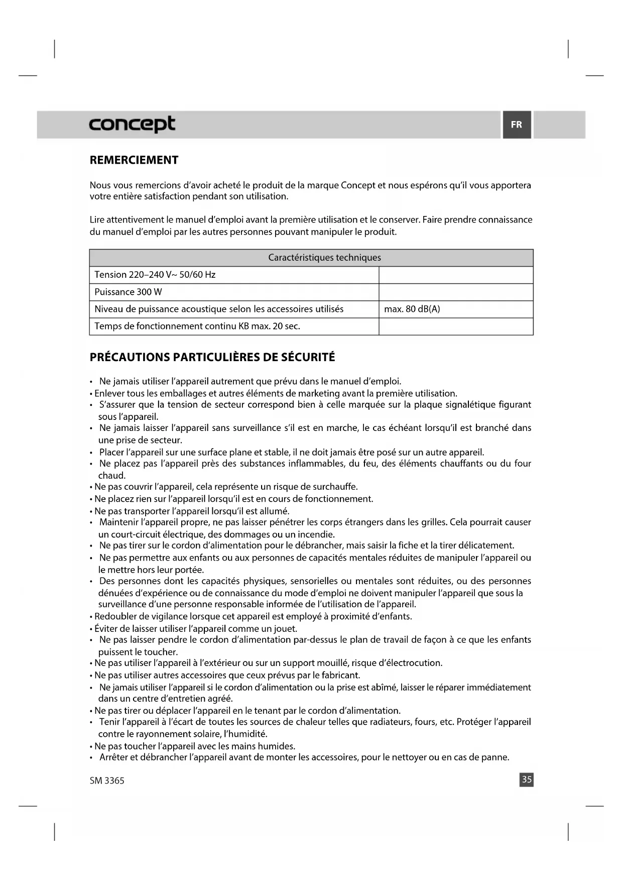 REMERCIEMENT Nous vous remercions d’avoir acheté le produit de la marque Concept et nous espérons qu’il vous apportera votre entière satisfaction pendant son utilisation. Lire attentivement le manuel d’emploi avant la première utilisation et le conserver. Faire prendre connaissance du manuel d’emploi par les autres personnes pouvant manipuler le produit. Caractéristiques techniques Tension 220–240 V~ 50/60 Hz Puissance 300 W Niveau de puissance acoustique selon les accessoires utilisés max. 80 dB(A) Temps de fonctionnement continu KB max. 20 sec. PRÉCAUTIONS PARTICULIÈRES DE SÉCURITÉ