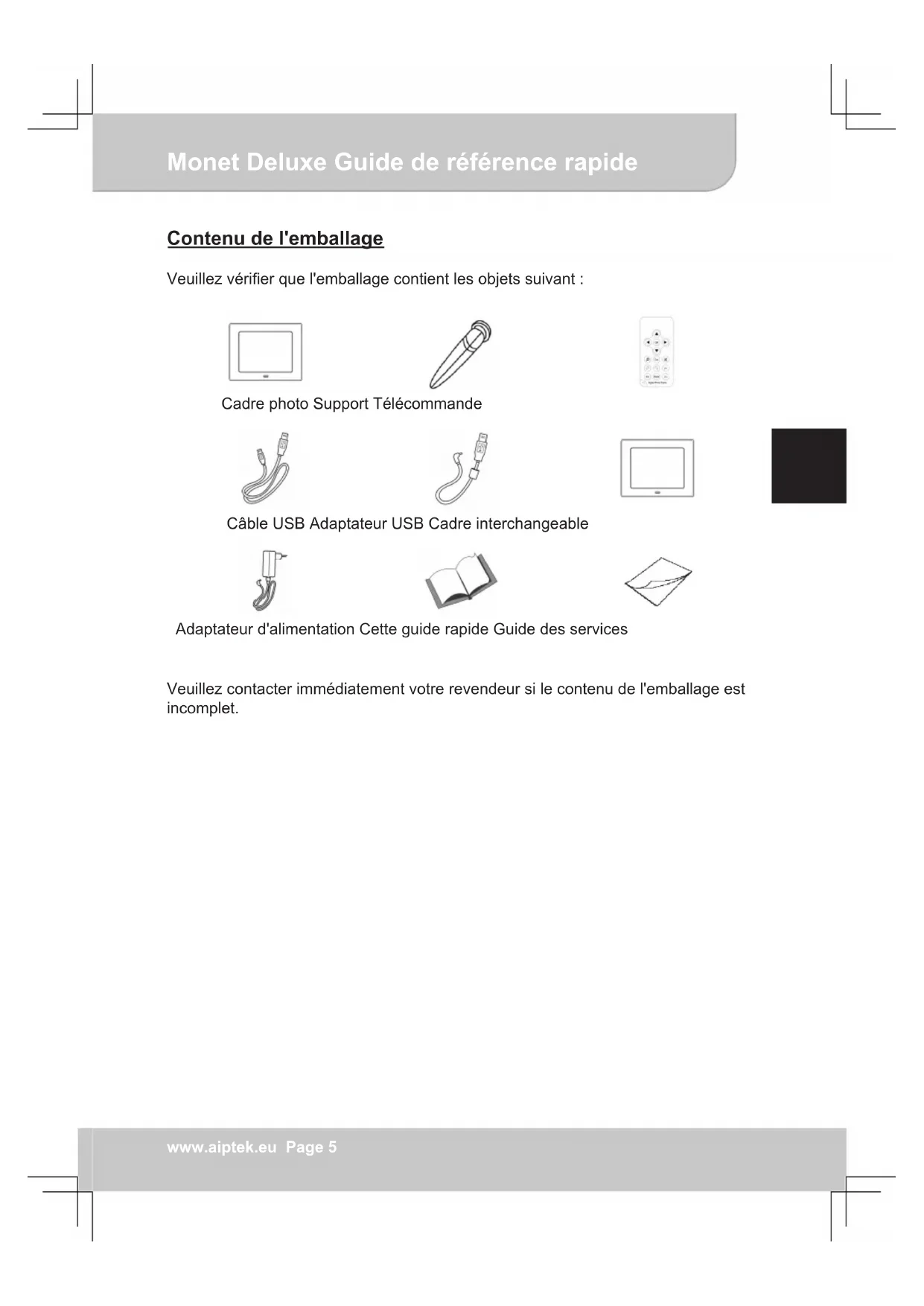Nous vous remercions de l'achat du Monet Deluxe d'Aiptek. Monet Deluxe est un cadre photo numérique 8" qui permet de voir aussi bien vos photos que vos vidéos et fichiers MP3. Ainsi, plus rien ne vous empêchera de profiter d'une expérience multimédia dans une atmosphère détendue. Avec une mémoire interne de 1Go et le support des cartes mémoires les plus fréquentes, tous vos enregistrements pourraient être facilement transférés et lus par ce cadre photo numérique. Et cela que vous soyez confortablement installé sur votre canapé ou directement en face du cadre photo numérique. Le grand angle de vision de l'écran de haute qualité et la télécommande fournie en série transformeront chaque minute d'utilisation de ce cadre photo numérique en une expérience formidable.