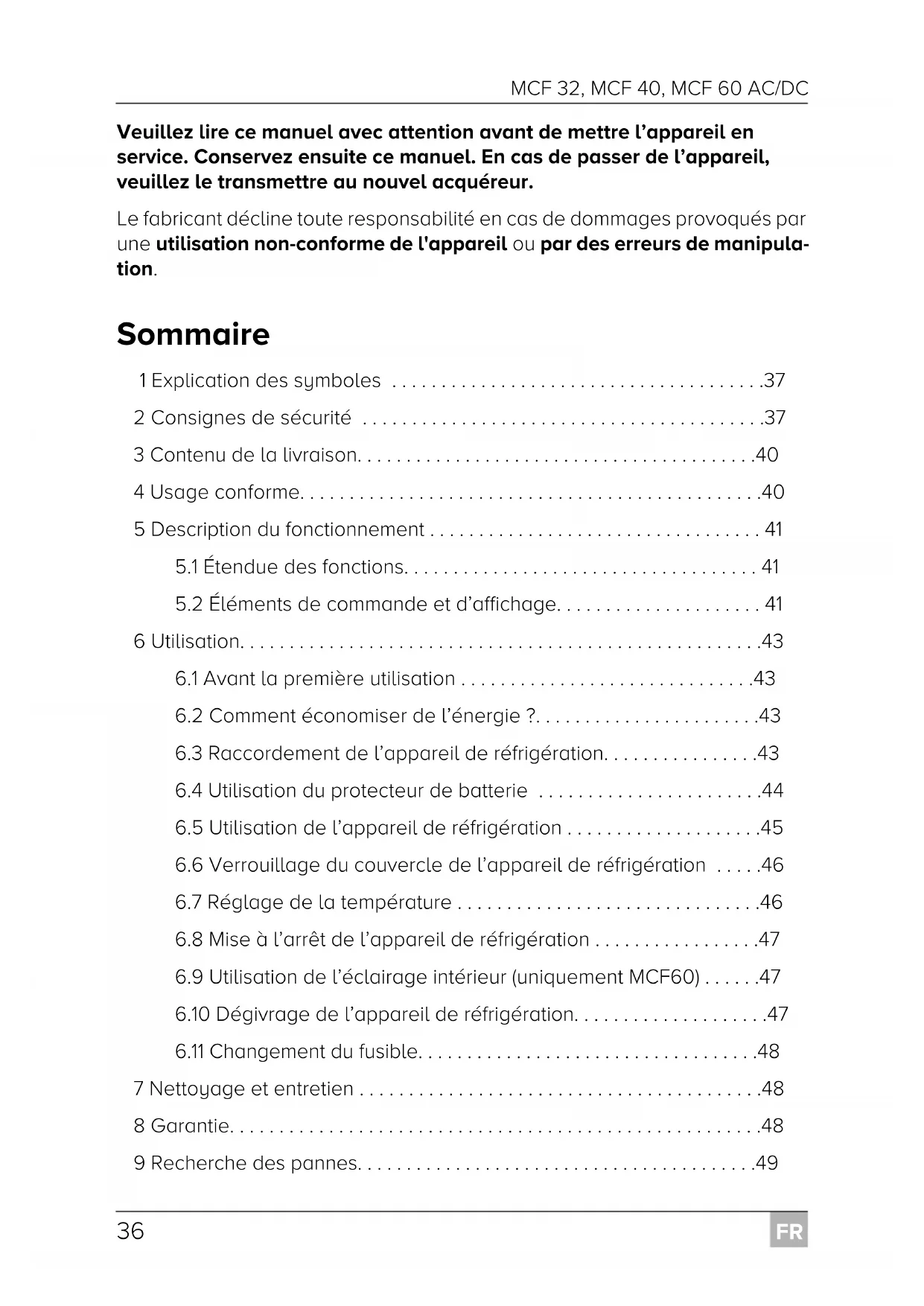 Lorsque vous mettrez votre produit définitivement hors service, infor- mez-vous auprès du centre de recyclage le plus proche ou auprès de votre revendeur spécialisé sur les prescriptions relatives au retraitement des déchets. 11 Caractéristiques techniques MCF32 AC/DC MCF40 AC/DC MCF60 AC/DCTension de raccordement :12/24 Vg 100 – 240 Vw, 50/60 Hz Puissance absorbée : 4 A (12 Vg) 6 A (12 Vg) 2A (24Vg) 3 A (24 Vg) 1,0 – 0,4 A (100 – 240 Vw) Puissance frigorifique : +10 °C à –10 °C(+50 °F à +14 °F)Catégorie : Catégorie 1(réfrigérateur avec un ou plusieurs compartiments de rangement pour aliments frais) Capacité brute : 32,5 l 40 l 60 l Capacité utilisable : 31,0 l 38 l 58 l Classe d’efficacité énergétique :