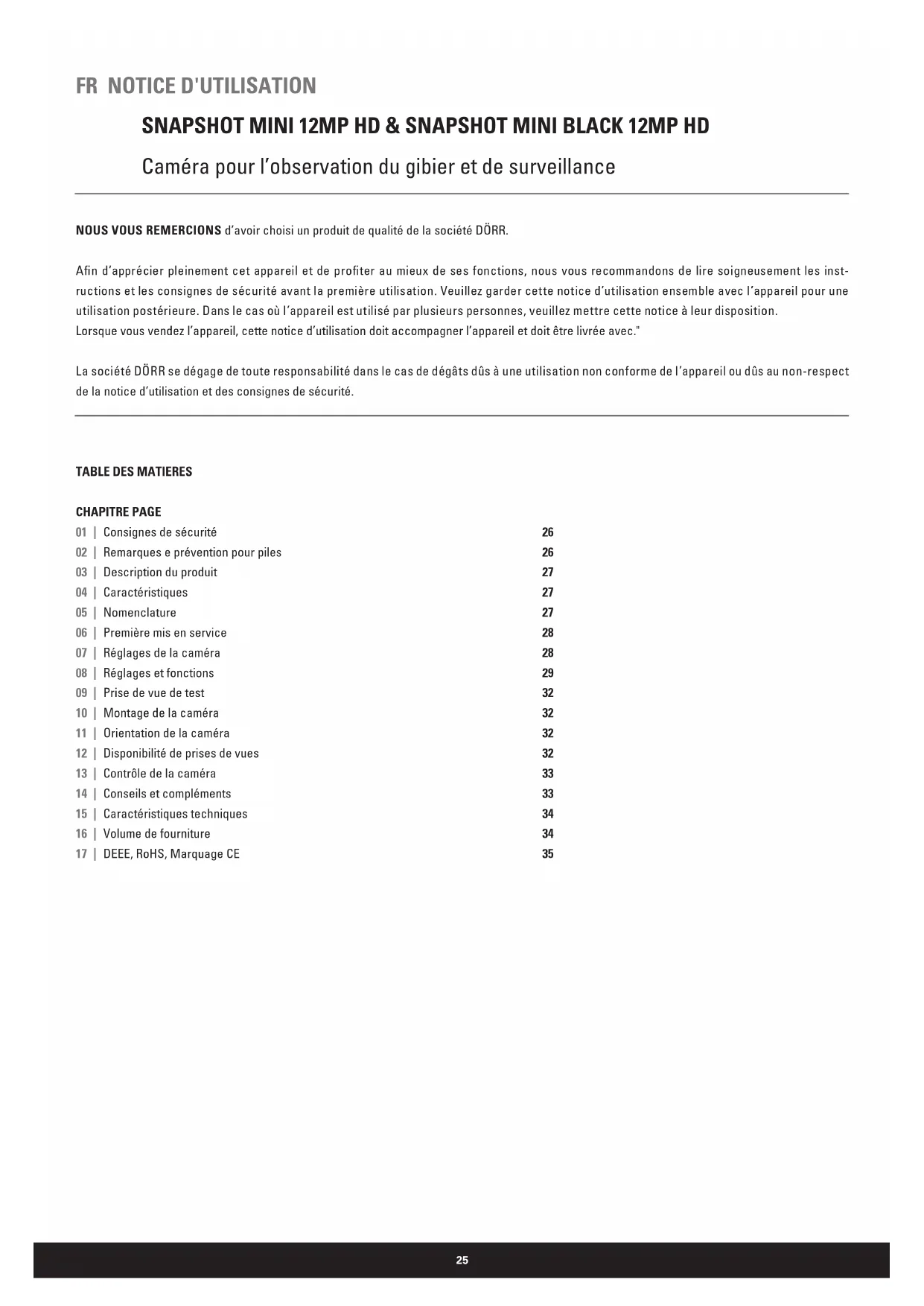 CHAPITRE PAGE 01 | 02 | 03 | 04 | 05 | 06 | 07 | 08 | 09 | 10 | 11 | 12 | 13 | 14 | 15 | 16 | 17 | Consignes de sécurité Remarques e prévention pour piles Description du produit Caractéristiques Nomenclature Première mis en service Réglages de la caméra Réglages et fonctions Prise de vue de test Montage de la caméra Orientation de la caméra Disponibilité de prises de vues Contrôle de la caméra Conseils et compléments Caractéristiques techniques Volume de fourniture DEEE, RoHS, Marquage CE