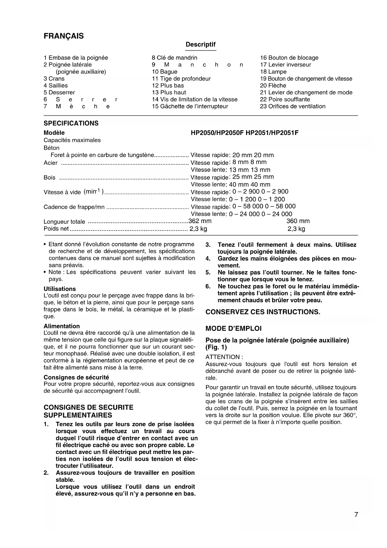 Pose de la poignée latérale (poignée auxiliaire) (Fig. 1) ATTENTION : Assurez-vous toujours que l'outil est hors tension et débranché avant de poser ou de retirer la poignée laté- rale. Pour garantir un travail en toute sécurité, utilisez toujours la poignée latérale. Installez la poignée latérale de façon que les crans de la poignée s’insèrent entre les saillies du collet de l’outil. Puis, serrez la poignée en la tournant vers la droite sur la position voulue. Elle pivote sur 360°, ce qui permet de la fixer à n’importe quelle position.8 Installation et retrait du foret (Fig. 2 et 3) ATTENTION : Vérifiez toujours que l’outil est arrêté et que son cable d’alimentation est débranché avant d’installer ou de reti- rer le foret. Pour HP2050 et HP2050F Pour installer le foret, introduisez-le à fond dans le man- drin. Serrez le mandrin à la main. Puis introduisez la clé de mandrin dans chacun des trois trous et serrez en tour- nant vers la droite. Veillez à bien serrer les trois trous de façon uniforme. Pour retirer le foret, tournez la clé de mandrin vers la gauche dans l’un des trois trous seulement, puis desser- rez à la main. Après avoir utilisé la clé de mandrin, repla- cez-la dans le porte-clé. Pour HP2051 et HP2051F Saisissez la bague et tournez le manchon vers la gauche pour ouvrir les mâchoires du mandrin. Placez la mèche dans le mandrin en l'enfonçant le plus loin possible. Sai- sissez fermement la bague et tournez le manchon vers la droite pour serrer le mandrin. Pour retirer la mèche, sai- sissez la bague et tournez le manchon vers la gauche. Tige de profondeur (Fig. 4) La tige de profondeur vous permet de percer des trous de longueur uniforme. Desserrez la poignée latérale et insérez la tige de profondeur dans l’orifice à la embase de la poignée. Réglez la tige à la profondeur voulue puis serrez la poignée latérale. NOTE : La tige de profondeur ne pourra pas être utilisée à l’endroit où elle bute sur le carter d’engrenage/carter moteur. Interrupteur (Fig. 5) ATTENTION : Avant de brancher l’outil, vérifiez toujours que la gâchette de l’interrupteur fonctionne et qu’elle revient sur la posi- tion “OFF” une fois relâchée. Pour mettre l’outil en route, il suffit de tirer sur la gâchette de l’interrupteur. Plus vous appuyez sur la gâchette de l’interrupteur, plus la vitesse de l’outil augmente. Pour arrêter l’outil, relâchez la gâchette de l’interrupteur. Pour obtenir un fonctionnement continu, tirez sur la gâchette de l’interrupteur et appuyez sur le bouton de blocage. Pour arrêter l’outil lorsqu’il fonctionne en continu, tirez à fond sur la gâchette de l’interrupteur et relâchez-la. Une vis de limitation de la vitesse est fournie pour limiter (faire varier) la vitesse maximale de l'outil. Tournez la vis de limitation de la vitesse vers la droite pour augmenter la vitesse ou en sens inverse pour la réduire. Allumage de la lampe (HP2050F et HP2051F) ATTENTION : Evitez de regarder directement le faisceau lumineux ou sa source. Pour allumer la lampe, appuyez sur la gâchette. Pour l'éteindre, relâchez la gâchette. NOTE : Utilisez un chiffon sec pour essuyer la saleté qui recou- vre la lentille de la lampe. Prenez garde de rayer la len- tille de la lampe, pour éviter une diminution de l'éclairage. Inverseur (Fig. 6) Cet outil est muni d'un inverseur pour modifier le sens de rotation. Déplacez l'inverseur sur la position