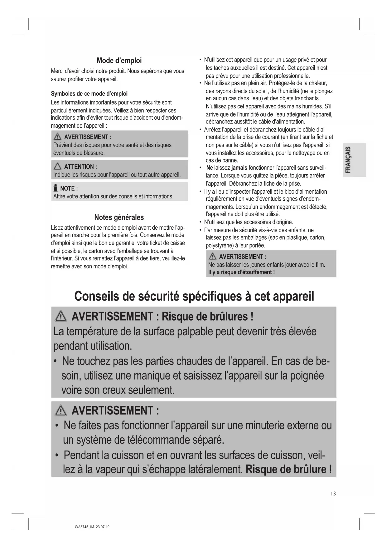 - Conservez l’appareil et son cordon hors de portée des enfants de moins de 8 ans.WA3745_IM 23.07.19