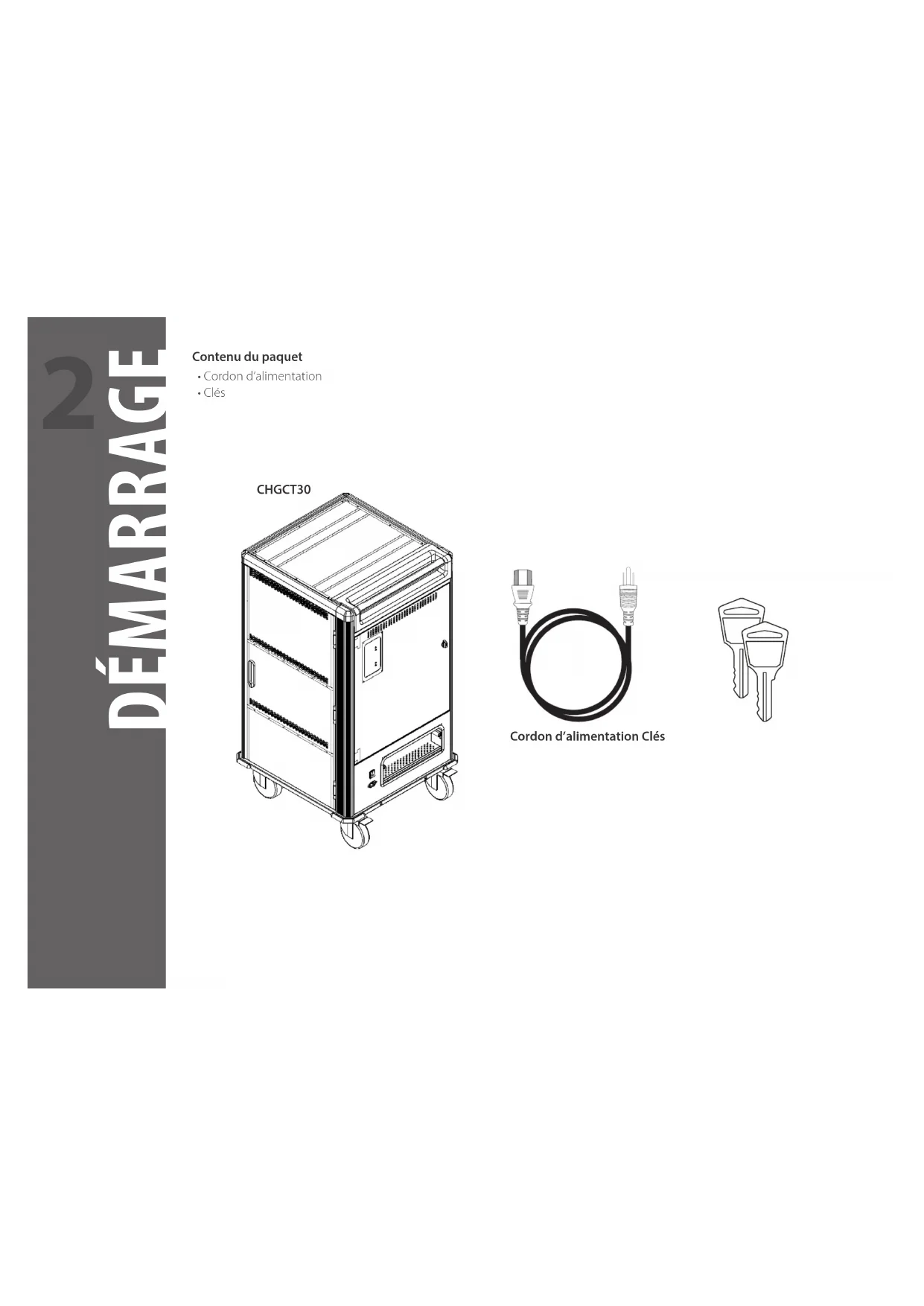 - Clés Cordon d’alimentation Clés CHGCT30Schéma du chariot Avant Poignée Assistance Support de câble d'alimentation Indicateur de charge à LED Roulettes 12,7cm Roulettes verrouillables 12,7cm Anneau pour cadenas Bouton marche/arrêt Entrée d’alimentation Amortisseurs en caoutchouc (4coins) Supports d'alimentation PDU intégrée Point de verrouillage *Cadenas non inclus Fentes pour appareils Ouverture pour câbles d’alimentationExtraction de la palette