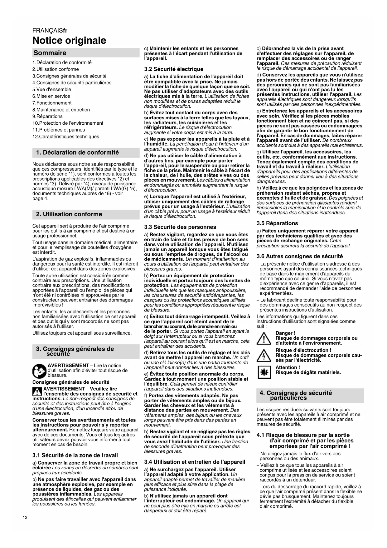 Notice originale 1.Déclaration de conformité 2.Utilisation conforme 3.Consignes générales de sécurité 4.Consignes de sécurité particulières 5.Vue d'ensemble 6.Mise en service 7.Fonctionnement 8.Maintenance et entretien 9.Réparations 10.Protection de l'environnement 11.Problèmes et pannes 12.Caractéristiques techniques Nous déclarons sous notre seule responsabilité, que ces compresseurs, identifiés par le type et le numéro de série *1), sont conformes à toutes les prescriptions applicables des directives *2) et normes *3). Délivré par *4), niveau de puissance acoustique mesuré LWA(M)/ garanti LWA(G) *5), documents techniques auprès de *6) - voir page 4. Cet appareil sert à produire de l'air comprimé pour les outils à air comprimé et est destiné à un usage professionnel. Tout usage dans le domaine médical, alimentaire et pour le remplissage de bouteilles d'oxygène est interdit. L'aspiration de gaz explosifs, inflammables ou dangereux pour la santé est interdite. Il est interdit d'utiliser cet appareil dans des zones explosives. Toute autre utilisation est considérée comme contraire aux prescriptions. Une utilisation contraire aux prescriptions, des modifications apportées à l'appareil ou l'emploi de pièces qui n'ont été ni contrôlées ni approuvées par le constructeur peuvent entraîner des dommages imprévisibles ! Les enfants, les adolescents et les personnes non familiarisées avec l'utilisation de cet appareil et des outils qui y sont raccordés ne sont pas autorisés à l'utiliser. Utilisez toujours cet appareil sous surveillance. AVERTISSEMENT – Lire la notice d'utilisation afin d'éviter tout risque de blessure. Consignes générales de sécurité AVERTISSEMENT – Veuillez lire l'ensemble des consignes de sécurité et instructions. Le non-respect des consignes de sécurité et des instructions peut être à l'origine d'une électrocution, d'un incendie et/ou de blessures graves. Conserver tous les avertissements et toutes les instructions pour pouvoir s'y reporter ultérieurement. Remettez toujours votre appareil avec de ces documents. Vous et tous les autres utilisateurs devez pouvoir vous informer à tout moment en cas de besoin.