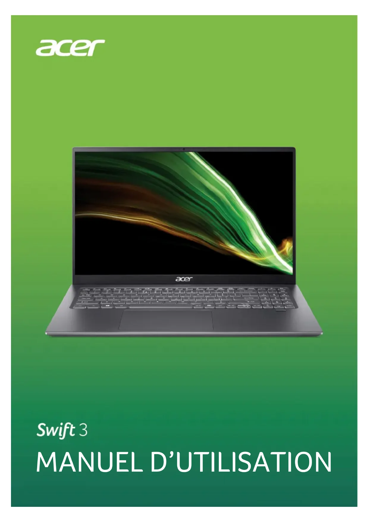 © 2021. Tous droits réservés. Swift 3 Couvre : SF316-51 Cette révision : 03/2021 Enregistrer votre produit Acer Si votre nouvel appareil fonctionne sous le système d’exploitation Windows, il est possible que votre produit ait été enregistré automatiquement lors du démarrage de votre appareil avec le système d’exploitation Windows. Connectez-vous à l’adresse www.acer.com/myproducts avec l’adresse e-mail que vous avez enregistrée pour le système d’exploitation Windows afin de consulter votre fiche produit. (Réinitialisez votre mot de passe si vous ne le connaissez pas.) Si la fiche n’est pas trouvée, veuillez suivre les étapes ci-dessous pour vous inscrire. 1.Assurez-vous d'être connecté à Internet. 2.Allez à www.acer.com/register-product. 3.Connectez-vous ou inscrivez-vous pour obtenir Acer ID. 4.Entrez le N/S ou le SNID de votre appareil pour l’enregistrer. Important Ce manuel contient des informations propriétaires qui sont protégées par les lois sur le copyright. Les informations contenues dans ce manuel peuvent être modifiées sans préavis. Certaines fonctionnalités décrites dans ce manuel peuvent ne pas être prises en charge en fonction de la version du système d’exploitation. Les images fournies ici sont pour référence seulement et peuvent contenir des informations ou des fonctionnalités qui ne s’appliquent pas à votre ordinateur. Le Groupe Acer ne peut être tenu responsable des erreurs ou omissions techniques ou éditoriales contenues dans ce manuel. Numéro de modèle : ____________________________ Numéro de série : ______________________________ Date d’achat : _________________________________ Lieu d’achat : __________________________________ Les termes HDMI et High-Definition Multimedia Interface ainsi que le logo HDMI sont des marques commerciales ou des marques déposées de HDMI Licensing Administrator, Inc. aux États-Unis et dans d’autres pays.Table des matières - 3