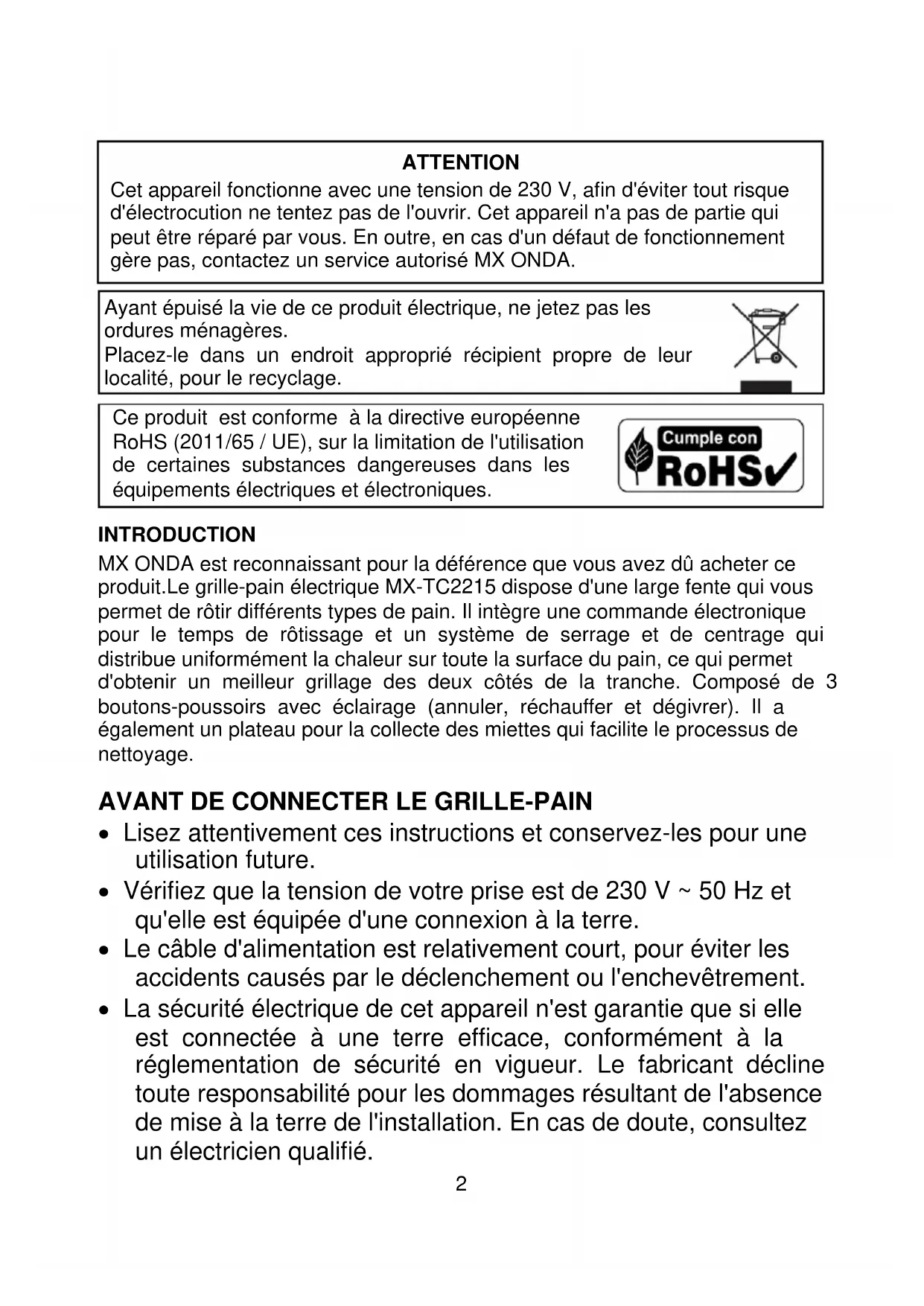 Ce produit est conforme à la directive européenne RoHS (2011/65 / UE), sur la limitation de l'utilisation de certaines substances dangereuses dans les équipements électriques et électroniques. INTRODUCTION MX ONDA est reconnaissant pour la déférence que vous avez dû acheter ce produit.Le grille-pain électrique MX-TC2215 dispose d'une large fente qui vous permet de rôtir différents types de pain. Il intègre une commande électronique pour le temps de rôtissage et un système de serrage et de centrage qui distribue uniformément la chaleur sur toute la surface du pain, ce qui permet d'obtenir un meilleur grillage des deux côtés de la tranche. Composé de 3 boutons-poussoirs avec éclairage (annuler, réchauffer et dégivrer). Il a également un plateau pour la collecte des miettes qui facilite le processus de nettoyage.