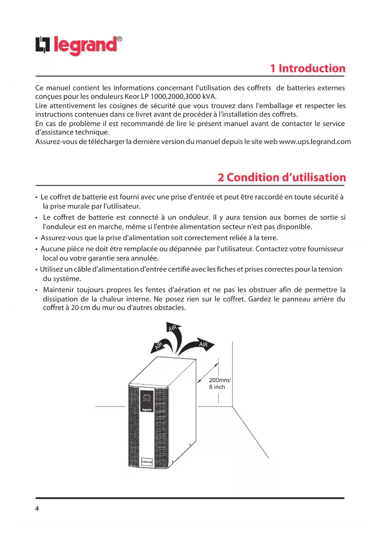 1 Introduction Ce manuel contient les informations concernant l’utilisation des coffrets de batteries externes conçues pour les onduleurs Keor LP 1000,2000,3000 kVA. Lire attentivement les cosignes de sécurité que vous trouvez dans l’emballage et respecter les instructions contenues dans ce livret avant de procéder à l’installation des coffrets. En cas de problème il est recommandé de lire le présent manuel avant de contacter le service d’assistance technique. Assurez-vous de télécharger la dernière version du manuel depuis le site web www.ups.legrand.com