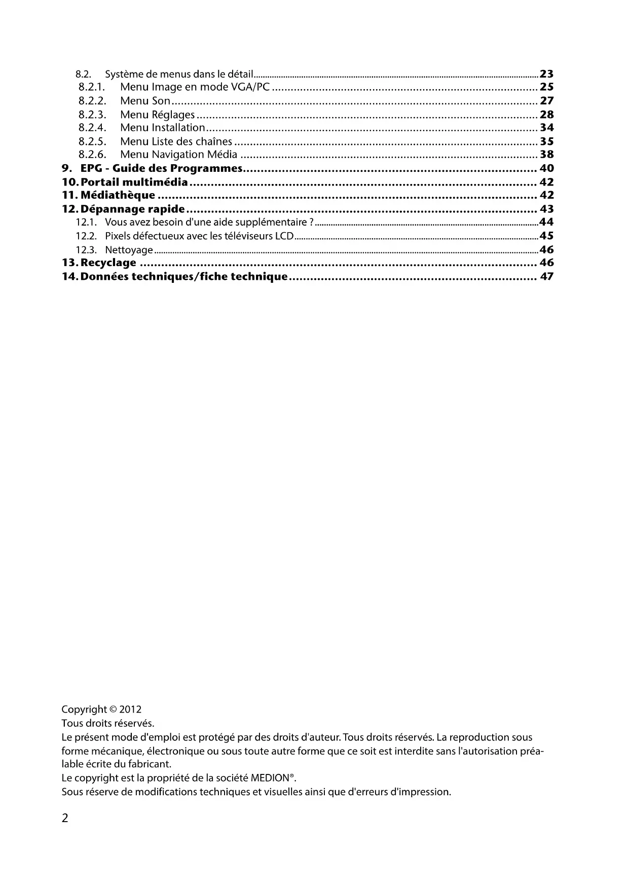 Copyright © 2012 Tous droits réservés. Le présent mode d'emploi est protégé par des droits d'auteur. Tous droits réservés. La reproduction sous forme mécanique, électronique ou sous toute autre forme que ce soit est interdite sans l'autorisation préa- lable écrite du fabricant. Le copyright est la propriété de la société MEDION®. Sous réserve de modifications techniques et visuelles ainsi que d'erreurs d'impression.3