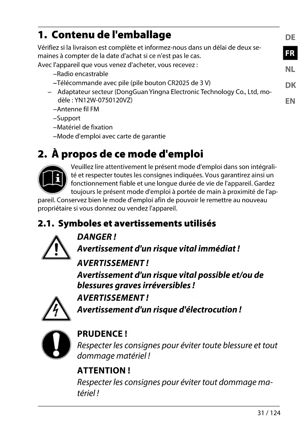 Vérifiez si la livraison est complète et informez-nous dans un délai de deux se- maines à compter de la date d'achat si ce n'est pas le cas. Avec l'appareil que vous venez d'acheter, vous recevez: − Radio encastrable − Télécommande avec pile (pile bouton CR2025 de 3 V) − Adaptateur secteur (DongGuan Yingna Electronic Technology Co., Ltd, mo- dèle : YN12W-0750120VZ) − Antenne fil FM − Support − Matériel de fixation − Mode d'emploi avec carte de garantie