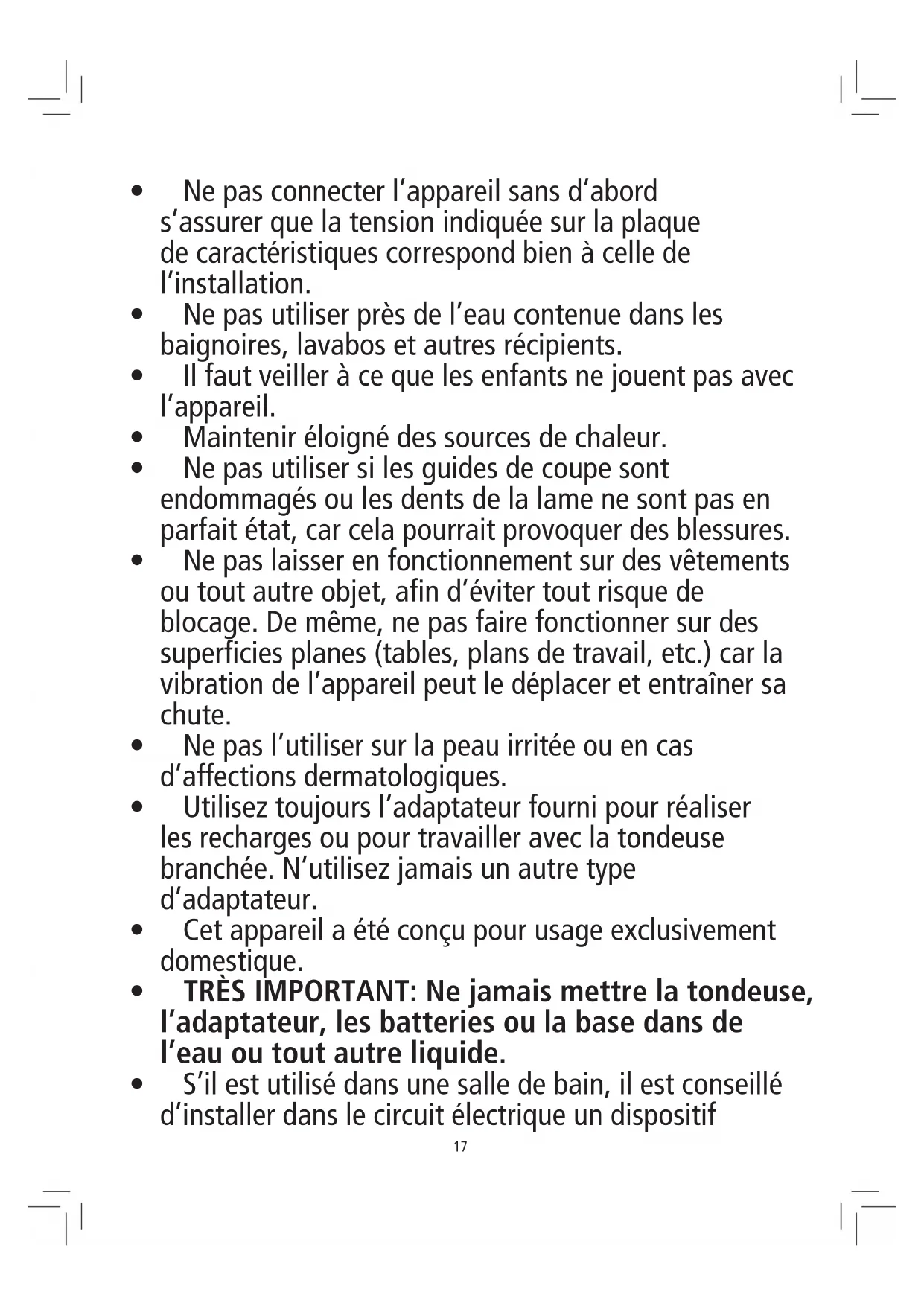 - Ne pas utiliser près de l’eau contenue dans les baignoires, lavabos et autres récipients.