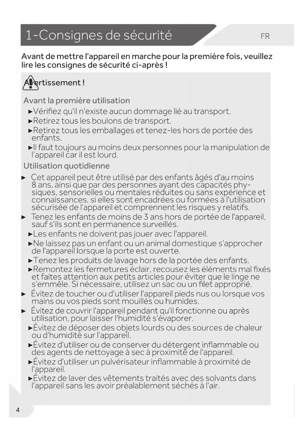 Avant de mettre l'appareil en marche pour la première fois, veuillez lire les consignes de sécurité ci-après! Avertissement! Avant la première utilisation ▶ Vériez qu'il n'existe aucun dommage lié au transport. ▶ Retirez tous les boulons de transport. ▶ Retirez tous les emballages et tenez-les hors de portée des enfants. ▶ Il faut toujours au moins deux personnes pour la manipulation de l’appareil car il est lourd. Utilisation quotidienne ▶ Cet appareil peut être utilisé par des enfants âgés d'au moins 8ans, ainsi que par des personnes ayant des capacités phy- siques, sensorielles ou mentales réduites ou sans expérience et connaissances, si elles sont encadrées ou formées à l'utilisation sécurisée de l'appareil et comprennent les risques y relatifs. ▶ Tenez les enfants de moins de 3ans hors de portée de l'appareil, sauf s'ils sont en permanence surveillés. ▶ Les enfants ne doivent pas jouer avec l'appareil. ▶ Ne laissez pas un enfant ou un animal domestique s'approcher de l'appareil lorsque la porte est ouverte. ▶ Tenez les produits de lavage hors de la portée des enfants. ▶ Remontez les fermetures éclair, recousez les éléments mal xés et faites attention aux petits articles pour éviter que le linge ne s'emmêle. Si nécessaire, utilisez un sac ou un let approprié. ▶ Évitez de toucher ou d'utiliser l'appareil pieds nus ou lorsque vos mains ou vos pieds sont mouillés ou humides. ▶ Évitez de couvrir l'appareil pendant qu'il fonctionne ou après utilisation, pour laisser l'humidité s'évaporer. ▶ Évitez de déposer des objets lourds ou des sources de chaleur ou d'humidité sur l'appareil. ▶ Évitez d'utiliser ou de conserver du détergent inammable ou des agents de nettoyage à sec à proximité de l'appareil. ▶ Évitez d'utiliser un pulvérisateur inammable à proximité de l'appareil. ▶ Évitez de laver des vêtements traités avec des solvants dans l'appareil sans les avoir préalablement séchés à l'air.FR 1-Consignes de sécurité