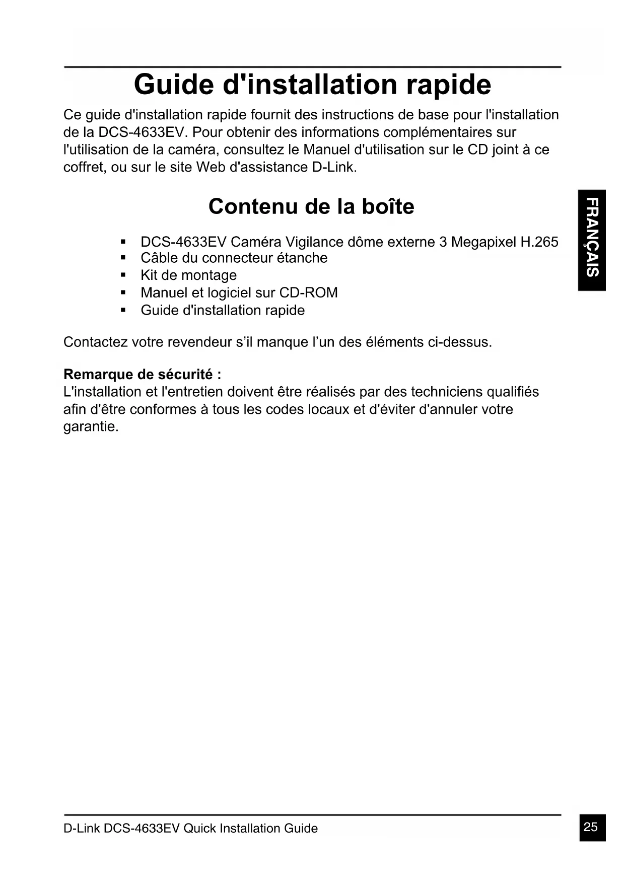 FRANÇAIS Guide d'installation rapide Ce guide d'installation rapide fournit des instructions de base pour l'installation de la DCS-4633EV. Pour obtenir des informations complémentaires sur l'utilisation de la caméra, consultez le Manuel d'utilisation sur le CD joint à ce coffret, ou sur le site Web d'assistance D-Link. Contenu de la boîte DCS-4633EV Caméra Vigilance dôme externe 3 Megapixel H.265 Câble du connecteur étanche Kit de montage Manuel et logiciel sur CD-ROM Guide d'installation rapide Contactez votre revendeur s’il manque l’un des éléments ci-dessus. Remarque de sécurité : L'installation et l'entretien doivent tre raliss par des techniciens qualis an d'tre conformes tous les codes locaux et d'viter d'annuler votre garantie.D-Link DCS-4633EV Quick Installation Guide