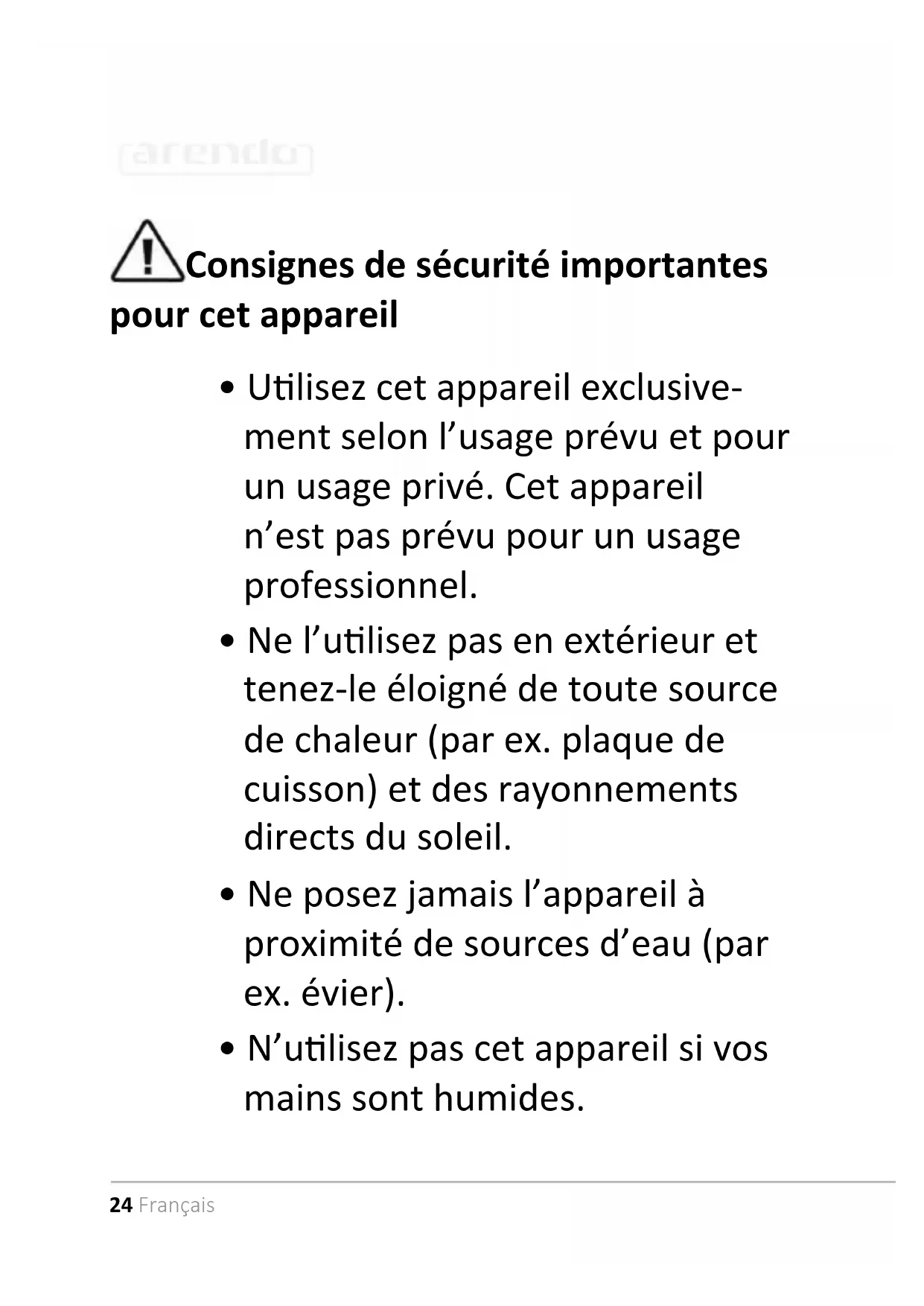 - Ne posez jamais l’appareil à proximité de sources d’eau (par ex. évier).