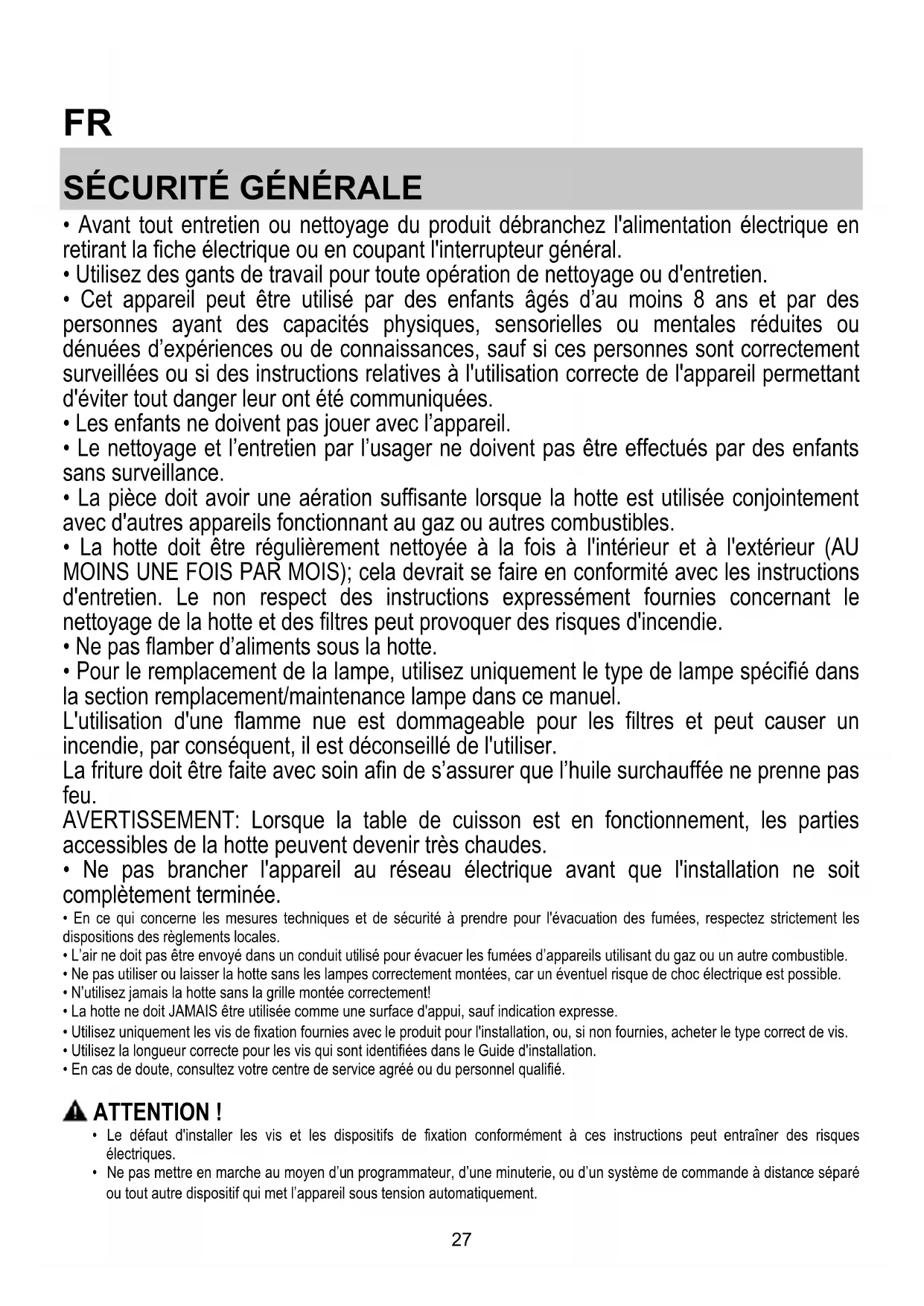 - La hotte ne doit JAMAIS être utilisée comme une surface d'appui, sauf indication expresse.
