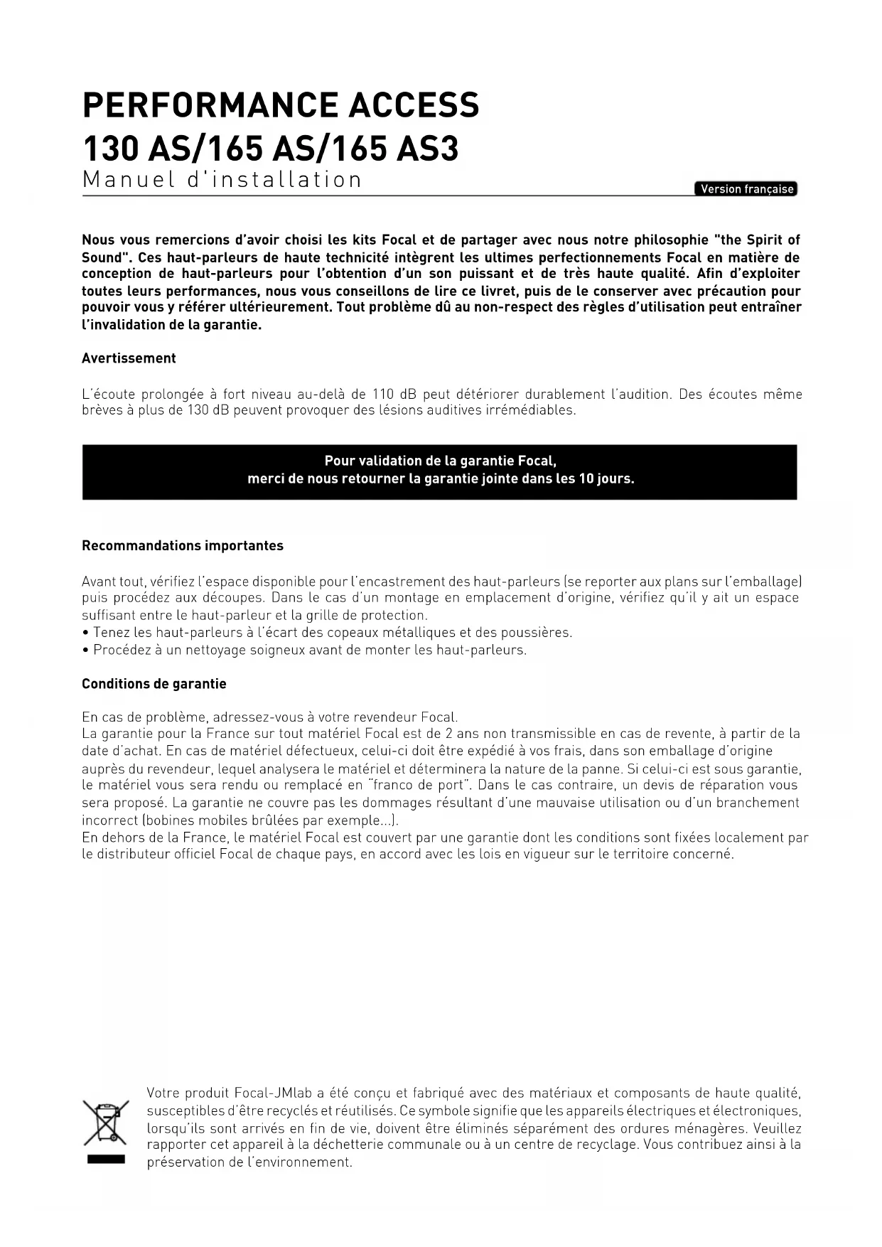 - Procédez à un nettoyage soigneux avant de monter les haut-parleurs. Conditions de garantie En cas de problème, adressez-vous à votre revendeur Focal. La garantie pour la France sur tout matériel Focal est de 2 ans non transmissible en cas de revente, à partir de la date d’achat. En cas de matériel défectueux, celui-ci doit être expédié à vos frais, dans son emballage d’origine auprès du revendeur, lequel analysera le matériel et déterminera la nature de la panne. Si celui-ci est sous garantie, le matériel vous sera rendu ou remplacé en “franco de port”. Dans le cas contraire, un devis de réparation vous sera proposé. La garantie ne couvre pas les dommages résultant d’une mauvaise utilisation ou d’un branchement incorrect (bobines mobiles brûlées par exemple...). En dehors de la France, le matériel Focal est couvert par une garantie dont les conditions sont fixées localement par le distributeur officiel Focal de chaque pays, en accord avec les lois en vigueur sur le territoire concerné. Version française Votre produit Focal-JMlab a été conçu et fabriqué avec des matériaux et composants de haute qualité, susceptibles d’être recyclés et réutilisés. Ce symbole signifie que les appareils électriques et électroniques, lorsqu’ils sont arrivés en fin de vie, doivent être éliminés séparément des ordures ménagères. Veuillez rapporter cet appareil à la déchetterie communale ou à un centre de recyclage. Vous contribuez ainsi à la préservation de l’environnement. PERFORMANCE ACCESS 130 AS/165 AS/165 AS3 Manuel d'installationPERfoRmancE accESS 130 aS/165 aS/165 aS3 Manuel d'installation