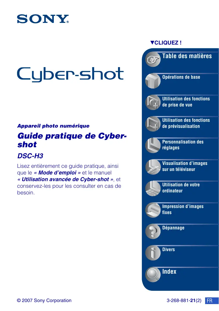 VCLIQUEZ ! Table des matières Opérations de base Utilisation des fonctions de prise de vue Appareil photo numérique Utilisation des fonctions de prévisualisation Guide pratique de Cybershot Personnalisation des réglages DSC-H3 Lisez entièrement ce guide pratique, ainsi que le « Mode d’emploi » et le manuel « Utilisation avancée de Cyber-shot », et conservez-les pour les consulter en cas de besoin. Visualisation d’images sur un téléviseur Utilisation de votre ordinateur Impression d’images fixes Dépannage Divers Index © 2007 Sony Corporation 3-268-881-21(2)