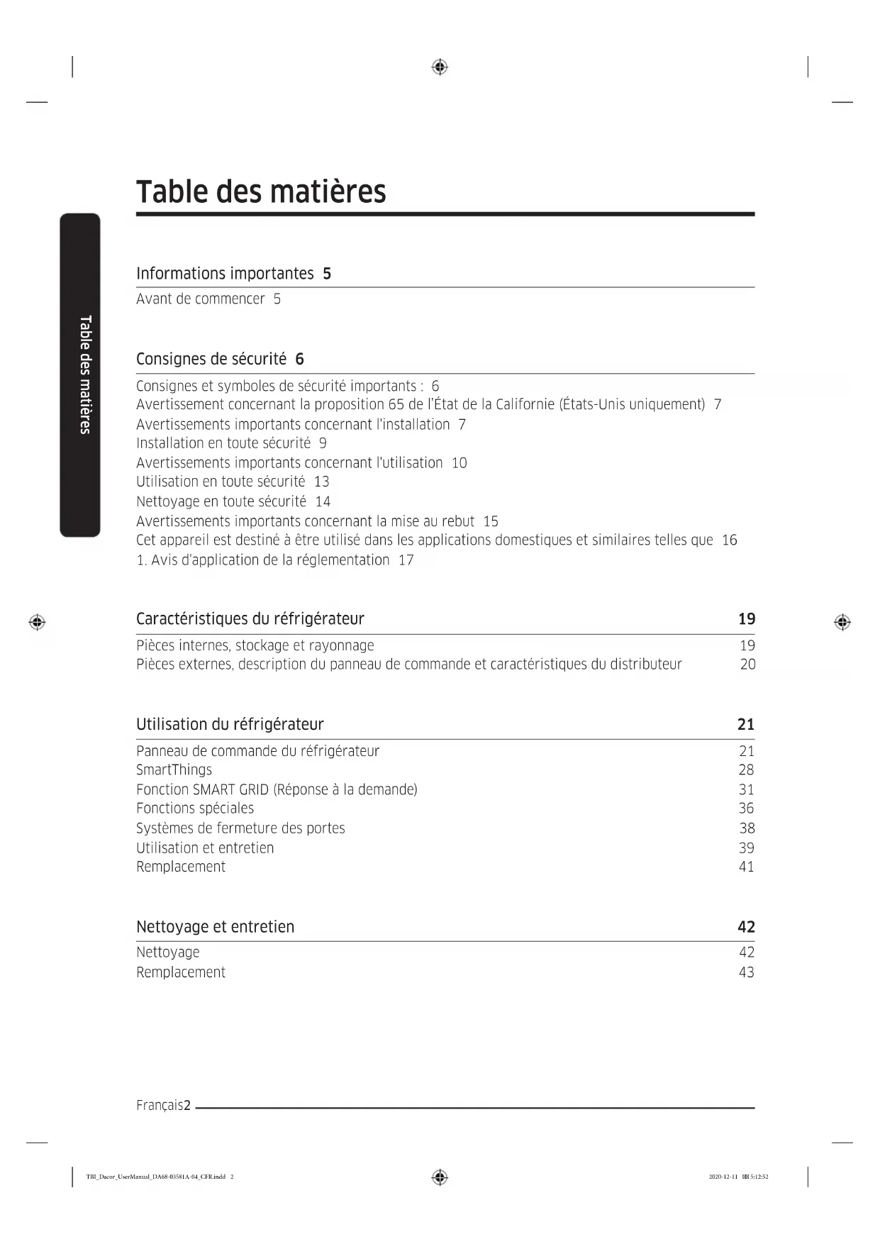 - Après avoir installé et mis sous tension votre réfrigérateur, laissez l'appareil au repos pendant 2 heures avant de le remplir d'aliments. TBI_Dacor_UserManual_DA68-03581A-04_CFR.indd 9 2020-12-11 5:12:52Français10 Consignes de sécurité Consignes de sécurité