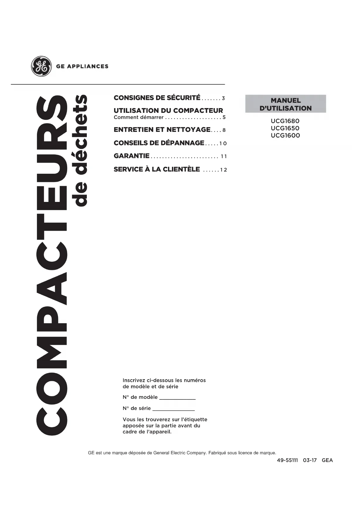 Profile UCG1600LBB - Compacteur de déchets GE - Notice d'utilisation et mode d'emploi gratuit
