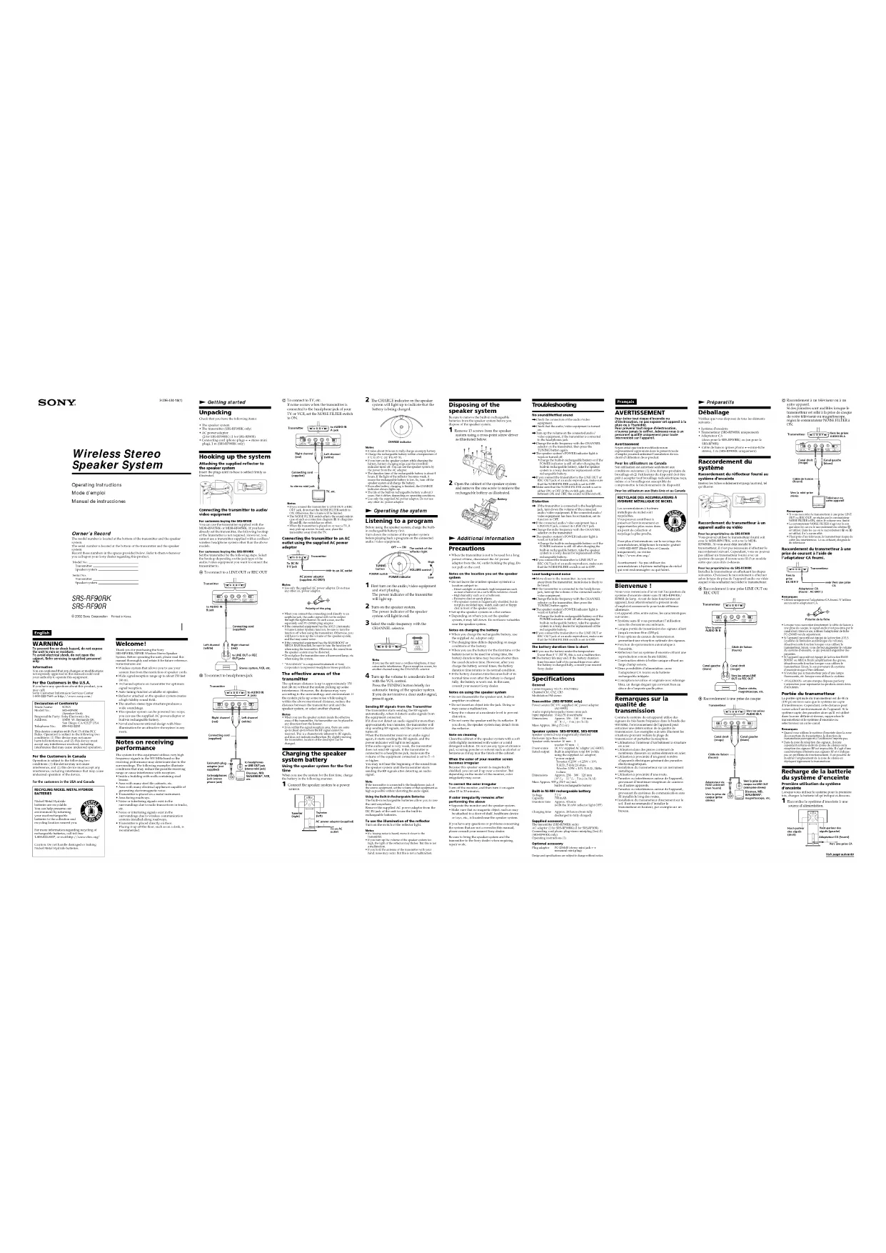 CHANNEL RBAL AUDIO IN TV, etc.to stereo mini jackTransmitterto AUDIO INA jackLeft channel(white)Right channel(red)Connecting cord(supplied)AC power adaptor (supplied)Tweeter(left)Tweeter(right)To an ACoutletOFF y ONThe switch of thereflector lightPOWER switchPOWER indicator High Low TUNINGbuttonVOLUME control Raccordement du système Raccordement du réflecteur fourni ausystème d’enceinteInsérez les fiches solidement et jusqu’au fond, telqu’illustré.Raccordement du transmetteur à unappareil audio ou vidéoPour les propriétaires du SRS-RF90RVous pouvez utiliser le transmetteur fourni soitavec le MDR-RF915RK, soit avec le MDR-RF945RK. Si vous avez déjà installé letransmetteur, il n’est pas nécessaire d’effectuer leraccordement suivant. Cependant, vous ne pouvezpas utiliser un transmetteur fourni avec unsystème de casque d’écoute sans fil d’un modèleautre que ceux cités ci-dessus.Pour les propriétaires du SRS-RF90RKInstallez le transmetteur en effectuant les étapessuivantes. Choisissez le raccordement à effectuerselon le type de prise de l’appareil audio ou vidéoauquel vous souhaitez raccorder le transmetteur.A Raccordement à une prise LINE OUT ouREC OUTB Raccordement à une prise de casque Bienvenue ! Nous vous remercions d’avoir fait l’acquisition dusystème d’enceinte stéréo sans fil SRS-RF90RK/RF90R de Sony. Avant de faire fonctionner cetappareil, lisez attentivement le présent moded’emploi et conservez-le pour toute référenceultérieure.Cet appareil offre, entre autres, les caractéristiquessuivantes :• Système sans fil vous permettant l’utilisationsans fils d’enceinte encombrants.• Longue portée de transmission des signaux allantjusqu’à environ 46 m (150 pi).• Trois options de canaux de transmissionpermettant une réception optimale des signaux.• Fonction de syntonisation automatique àl’enceinte.• Réflecteur fixé au système d’enceinte offrant unereproduction sonore haute fidélité.• Construction stéréo à boîtier unique offrant unlarge champ sonore.• Deux possibilités d’alimentation : avecl’adaptateur CA fourni ou la batterierechargeable intégrée.• Conception novatrice et originale avec éclairagebleu, un design élégant qui convient bien audécor de n’importe quelle pièce. Remarques sur la qualité de transmission Comme le système de cet appareil utilise dessignaux de très haute fréquence dans la bande des900 MHz, l’environnement de l’appareil peutentraîner une détérioration de la qualité detransmission. Les exemples suivants illustrent lessituations pouvant réduire la plage detransmission et perturber la réception.• Utilisation à l’intérieur d’un bâtiment à structureen acier.• Utilisation dans des pièces contenant denombreux classeurs ou autres éléments en acier.• Utilisation à proximité d’un grand nombred’appareils électriques générant des parasitesélectromagnétiques.• Installation du transmetteur sur un instrumentmétallique.• Utilisation à proximité d’une route.• Parasites ou interférences autour de l’appareil,provenant d’émetteurs-récepteurs de camionsou d’autres appareils.• Parasites ou interférences autour de l’appareil,provenant de systèmes de communication sansfil installés le long des routes.• Installation du transmetteur directement sur lesol. Il est recommandé d’installer letransmetteur en hauteur, par exemple sur unbureau. AVERTISSEMENT Pour éviter tout risque d’incendie oud’électrocution, ne pas exposer cet appareil à lapluie ou à l’humidité.Pour prévenir tout risque d’électrocution,n’ouvrez jamais le coffret. Adressez-vous à unpersonnel qualifié uniquement pour touteintervention sur l’appareil.AvertissementSoyez avisé que toute modification nonexpressément approuvée dans le présent moded’emploi pourrait entraîner l’annulation de vosdroits d’utilisation de ce produit.Pour les utilisateurs au CanadaSon utilisation est autorisée seulement auxconditions suivantes: (1) il ne doit pas produire debrouillage et (2) l’utilisateur du dispositif doit êtreprêt à accepter tout brouillage radioeléctrique reçu,même si ce brouillage est susceptible decompromettre le fonctionnement du dispositif. Français N Préparatifs Déballage Vérifiez que vous disposez de tous les élémentssuivants :• Système d’enceinte• Transmetteur (SRS-RF90RK uniquement)• Adaptateur CA(deux pour le SRS-RF90RK) ou (un pour leSRS-RF90R)