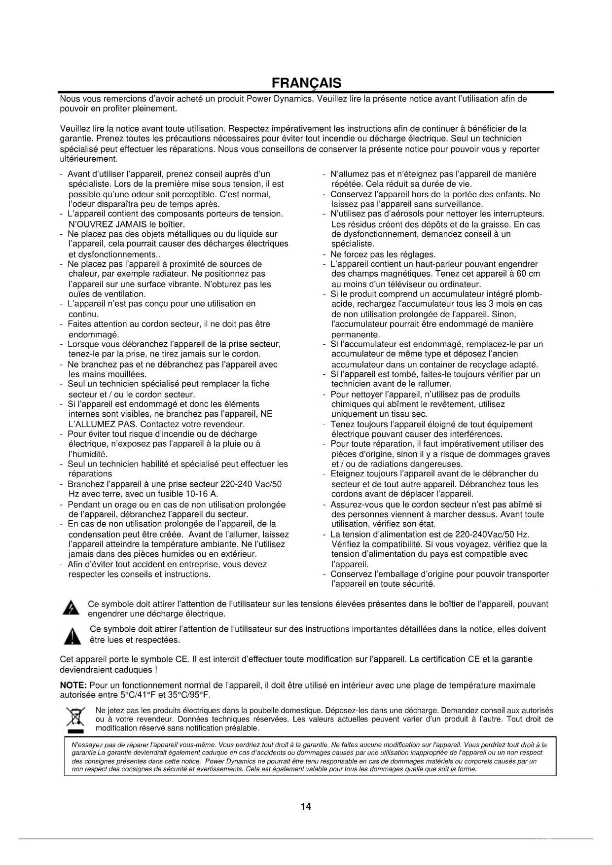 GB14 FRANÇAIS Nous vous remercions d’avoir acheté un produit Power Dynamics. Veuillez lire la présente notice avant l’utilisation afin de pouvoir en profiter pleinement. Veuillez lire la notice avant toute utilisation. Respectez impérativement les instructions afin de continuer à bénéficier de la garantie. Prenez toutes les précautions nécessaires pour éviter tout incendie ou décharge électrique. Seul un technicien spécialisé peut effectuer les réparations. Nous vous conseillons de conserver la présente notice pour pouvoir vous y reporter ultérieurement. - Avant d’utiliser l’appareil, prenez conseil auprès d’un spécialiste. Lors de la première mise sous tension, il est possible qu’une odeur soit perceptible. C’est normal, l’odeur disparaîtra peu de temps après. - L’appareil contient des composants porteurs de tension. N’OUVREZ JAMAIS le boîtier. - Ne placez pas des objets métalliques ou du liquide sur l’appareil, cela pourrait causer des décharges électriques et dysfonctionnements.. - Ne placez pas l’appareil à proximité de sources de chaleur, par exemple radiateur. Ne positionnez pas l’appareil sur une surface vibrante. N’obturez pas les ouïes de ventilation. - L’appareil n’est pas conçu pour une utilisation en continu. - Faites attention au cordon secteur, il ne doit pas être endommagé. - Lorsque vous débranchez l’appareil de la prise secteur, tenez-le par la prise, ne tirez jamais sur le cordon. - Ne branchez pas et ne débranchez pas l’appareil avec les mains mouillées. - Seul un technicien spécialisé peut remplacer la fiche secteur et / ou le cordon secteur. - Si l’appareil est endommagé et donc les éléments internes sont visibles, ne branchez pas l’appareil, NE L’ALLUMEZ PAS. Contactez votre revendeur. - Pour éviter tout risque d’incendie ou de décharge électrique, n’exposez pas l’appareil à la pluie ou à l’humidité. - Seul un technicien habilité et spécialisé peut effectuer les réparations - Branchez l’appareil à une prise secteur 220-240 Vac/50 Hz avec terre, avec un fusible 10-16 A. - Pendant un orage ou en cas de non utilisation prolongée de l’appareil, débranchez l’appareil du secteur. - En cas de non utilisation prolongée de l’appareil, de la condensation peut être créée. Avant de l’allumer, laissez l’appareil atteindre la température ambiante. Ne l’utilisez jamais dans des pièces humides ou en extérieur. - Afin d’éviter tout accident en entreprise, vous devez respecter les conseils et instructions. - N’allumez pas et n’éteignez pas l’appareil de manière répétée. Cela réduit sa durée de vie. - Conservez l’appareil hors de la portée des enfants. Ne laissez pas l’appareil sans surveillance. - N’utilisez pas d’aérosols pour nettoyer les interrupteurs. Les résidus créent des dépôts et de la graisse. En cas de dysfonctionnement, demandez conseil à un spécialiste. - Ne forcez pas les réglages. - L’appareil contient un haut-parleur pouvant engendrer des champs magnétiques. Tenez cet appareil à 60 cm au moins d’un téléviseur ou ordinateur. - Si le produit comprend un accumulateur intégré plomb- acide, rechargez l'accumulateur tous les 3 mois en cas de non utilisation prolongée de l'appareil. Sinon, l'accumulateur pourrait être endommagé de manière permanente. - Si l’accumulateur est endommagé, remplacez-le par un accumulateur de même type et déposez l’ancien accumulateur dans un container de recyclage adapté. - Si l’appareil est tombé, faites-le toujours vérifier par un technicien avant de le rallumer. - Pour nettoyer l’appareil, n’utilisez pas de produits chimiques qui abîment le revêtement, utilisez uniquement un tissu sec. - Tenez toujours l’appareil éloigné de tout équipement électrique pouvant causer des interférences. - Pour toute réparation, il faut impérativement utiliser des pièces d’origine, sinon il y a risque de dommages graves et / ou de radiations dangereuses. - Eteignez toujours l’appareil avant de le débrancher du secteur et de tout autre appareil. Débranchez tous les cordons avant de déplacer l’appareil. - Assurez-vous que le cordon secteur n’est pas abîmé si des personnes viennent à marcher dessus. Avant toute utilisation, vérifiez son état. - La tension d’alimentation est de 220-240Vac/50 Hz. Vérifiez la compatibilité. Si vous voyagez, vérifiez que la tension d’alimentation du pays est compatible avec l’appareil. - Conservez l’emballage d’origine pour pouvoir transporter l’appareil en toute sécurité. Ce symbole doit attirer l’attention de l’utilisateur sur les tensions élevées présentes dans le boîtier de l’appareil, pouvant engendrer une décharge électrique. Ce symbole doit attirer l’attention de l’utilisateur sur des instructions importantes détaillées dans la notice, elles doivent être lues et respectées. Cet appareil porte le symbole CE. Il est interdit d’effectuer toute modification sur l’appareil. La certification CE et la garantie deviendraient caduques ! NOTE: Pour un fonctionnement normal de l’appareil, il doit être utilisé en intérieur avec une plage de température maximale autorisée entre 5°C/41°F et 35°C/95°F. Ne jetez pas les produits électriques dans la poubelle domestique. Déposez-les dans une décharge. Demandez conseil aux autorisés ou à votre revendeur. Données techniques réservées. Les valeurs actuelles peuvent varier d’un produit à l’autre. Tout droit de modification réservé sans notification préalable. N’essayez pas de réparer l’appareil vous-même. Vous perdriez tout droit à la garantie. Ne faites aucune modification sur l’appareil. Vous perdriez tout droit à la garantie La garantie deviendrait également caduque en cas d’accidents ou dommages causes par une utilisation inappropriée de l’appareil ou un non respect des consignes présentes dans cette noti