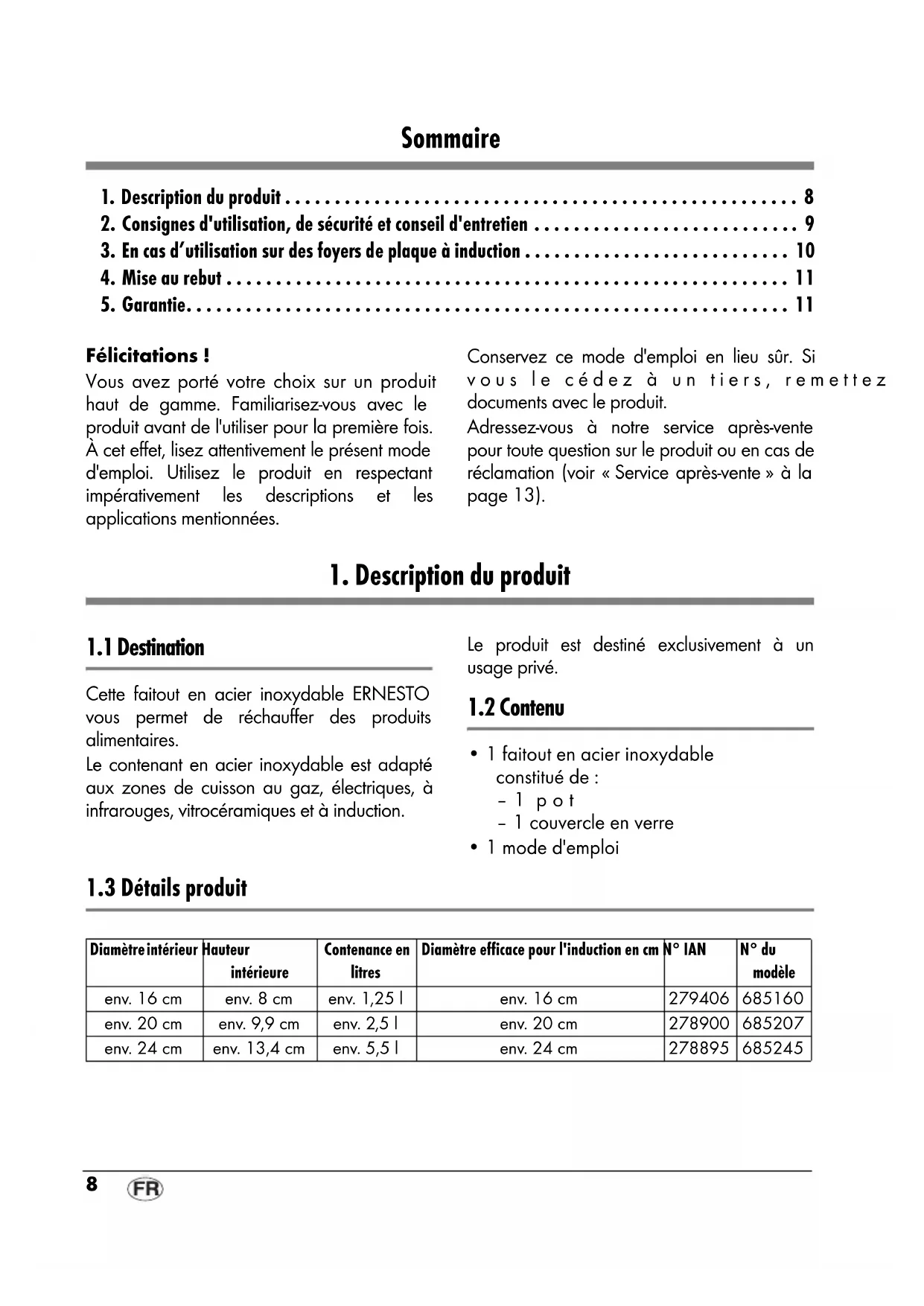 Diamètre intérieur Hauteur intérieure Contenance en litres Diamètre efficace pour l'induction en cm N° IAN N° du modèle env. 16 cm env. 8 cm env. 1,25 l env. 16 cm 279406 685160 env. 20 cm env. 9,9 cm env. 2,5 l env. 20 cm 278900 685207 env. 24 cm env. 13,4 cm env. 5,5 l env. 24 cm 278895 6852459