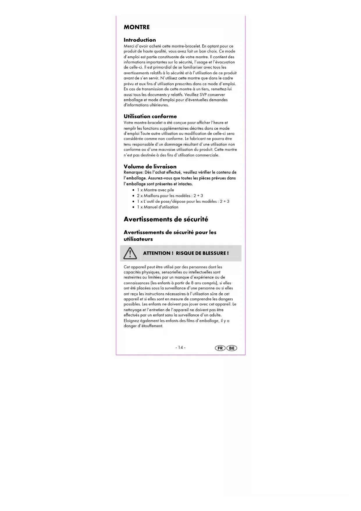 MONTRE Introduction Merci d’avoir acheté cette montre-bracelet. En optant pour ce produit de haute qualité, vous avez fait un bon choix. Ce mode d’emploi est partie constituante de votre montre. Il contient des informations importantes sur la sécurité, l’usage et l’évacuation de celle-ci. Il est primordial de se familiariser avec tous les avertissements relatifs à la sécurité et à l’utilisation de ce produit avant de s’en servir. N’utilisez cette montre que dans le cadre prévu et aux fins d’utilisation prescrites dans ce mode d’emploi. En cas de transmission de cette montre à un tiers, remettez-lui aussi tous les documents y relatifs. Veuillez SVP conserver emballage et mode d'emploi pour d'éventuelles demandes d'informations ultérieures. Utilisation conforme Votre montre-bracelet a été conçue pour afficher l’heure et remplir les fonctions supplémentaires décrites dans ce mode d‘emploi Toute autre utilisation ou modification de celle-ci sera considérée comme non conforme. Le fabricant ne pourra être tenu responsable d’un dommage résultant d’une utilisation non conforme ou d’une mauvaise utilisation du produit. Cette montre n’est pas destinée à des fins d’utilisation commerciale. Volume de livraison Remarque: Dès l’achat effectué, veuillez vérifier le contenu de l’emballage. Assurez-vous que toutes les pièces prévues dans l’emballage sont présentes et intactes. 1 x Montre avec pile 2 x Maillons pour les modèles : 2 + 3 1 x L’outil de pose/dépose pour les modèles : 2 + 3 1 x Manuel d'utilisation Avertissements de sécurité Avertissements de sécurité pour les utilisateurs