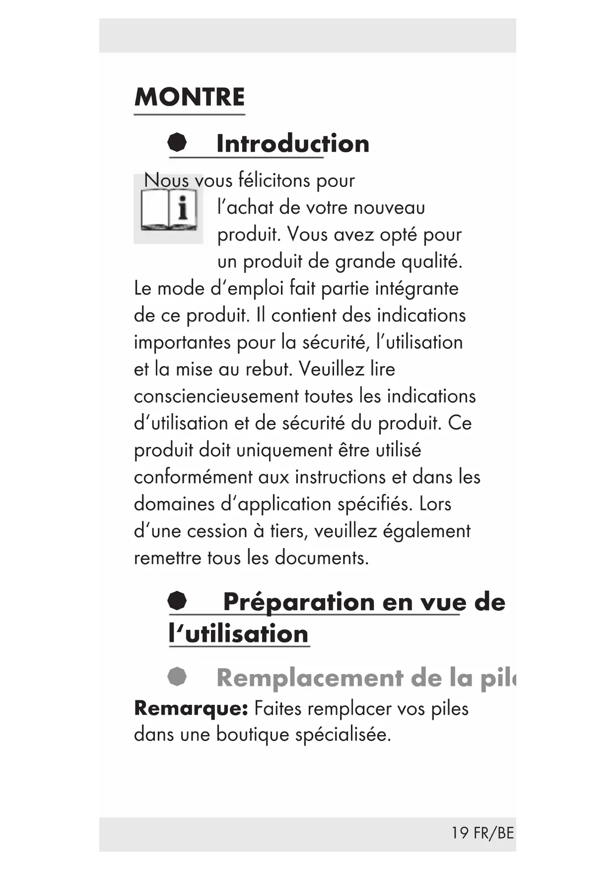 dans le sens contraire des aiguilles d‘une montre pour marquer le début d‘une mesure de temps. § Nettoyage et entretien Nettoyez uniquement l’extérieur du produit, à l’aide d’un chiffon doux sec.22 FR/BE § Recyclage L’emballage se compose de matières recyclables qui peuvent être mises au rebut dans les déchetteries locales. Les possibilités de recyclage des produits usés sont à demander auprès de votre municipalité. Pour le respect de l‘environnement, lorsque vous n‘utilisez plus votre produit, ne le jetez pas avec les ordures ménagères, mais entreprenez un recyclage adapté. Pour obtenir des renseignements et des horaires d‘ouverture concernant les points de collecte, vous pouvez contacter votre administration locale.23 FR/BE Les piles défectueuses ou usagées doivent être recyclées conformément à la directive 2006 / 66 / CE et ses modifications. Les piles et / ou l‘appareil doivent être retournés dans les centres de collecte. Pollution de l’environnement par mise au rebut incorrecte des piles ! Les piles ne doivent pas être mises au rebut dans les ordures ménagères. Elles peuvent contenir des métaux lourds toxiques et doivent être considérés comme des déchets spéciaux. Les symboles chimiques des métaux lourds sont les suivants : Cd = cadmium, Hg = mercure, Pb = plomb. Pour cette raison, veuillez toujours déposer les piles usées dans les conteneurs de recyclage communaux. § Garantie24 FR/BE Le produit a été fabriqué selon des critères de qualité stricts et contrôlé consciencieusement avant sa livraison. En cas de défaillance, vous êtes en droit de retourner ce produit au vendeur. La présente garantie ne constitue pas une restriction de vos droits légaux. Ce produit bénéficie d‘une garantie de 3 ans à compter de sa date d’achat. La durée de garantie débute à la date d’achat. Veuillez conserver le ticket de caisse original. Il fera office de preuve d’achat. Si un problème matériel ou de fabrica- tion devait survenir dans 3 ans suivant la date d‘achat de ce produit, nous assurons à notre discrétion la réparation ou le remplacement du produit sans frais supplémentaires. La garantie prend fin si le produit est endommagé suite à une utilisation inappropriée ou à un entretien défaillant.25 FR/BE La garantie couvre les vices matériels et de fabrication. Cette garantie ne s’étend ni aux pièces du produit soumises à une usure normale (p. ex. des piles) et qui, par conséquent, peuvent être considé- rées comme des pièces d’usure, ni aux dommages sur des composants fragiles, comme des interrupteurs, des batteries ou des éléments fabriqués en verre. La garantie ne couvre pas non plus la perte de l‘étanchéité à l‘eau. L‘état d‘étanchéité à l‘eau n‘est pas une propriété durable et fait l‘objet d‘une maintenance périodique. Veuillez noter que votre garantie devient caduque pour les cas suivants: ouverture et la réparation de votre montre par des personnes non autorisées.26 NL/BE HORLOGE § Inleiding Hartelijk gefeliciteerd met de aankoop van uw nieuwe product. U heeft voor een hoogwaardig product gekozen. De gebruiksaanwijzing is een deel van het product. Deze bevat belangrijke aanwijzingen voor veiligheid, gebruik en verwijdering. Maakt U zich voor de ingebruikname van het product met alle bedienings- en veiligheidsvoorschriften vertrouwd. Gebruik het product alleen zoals beschreven en voor de aangegeven toepassingsgebieden. Overhandig alle documenten bij doorgifte van het product aan derden. § Ingebruikneming § De batterij vervangen Opmerking: Laat de batterijen vervangen in een speciaalzaak.27 NL/BE § Display