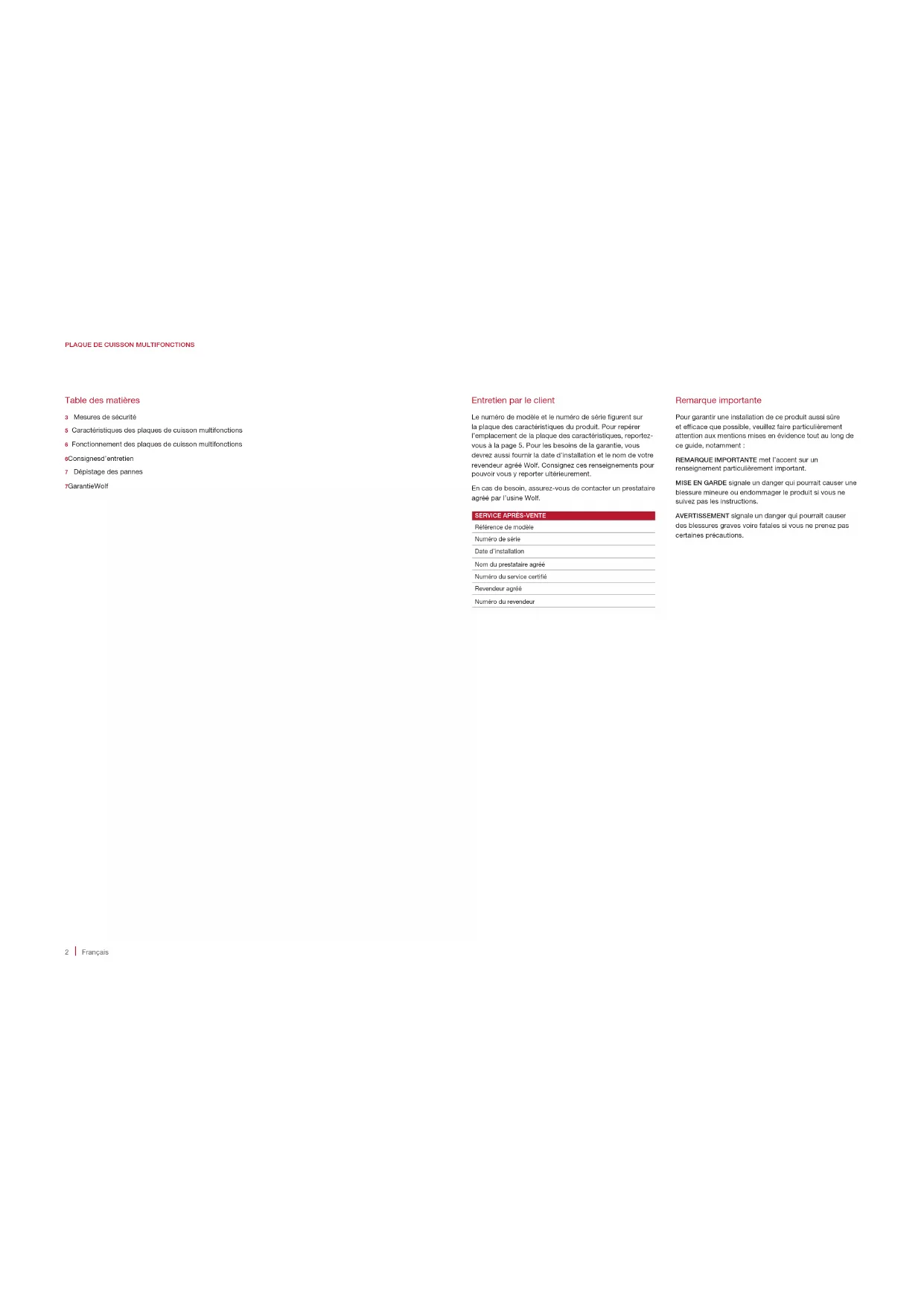 Référence de modèle Numéro de série Date d’installation Nom du prestataire agréé Numéro du service certié Revendeur agréé Numéro du revendeur Remarque importante Pour garantir une installation de ce produit aussi sûre et efcace que possible, veuillez faire particulièrement attention aux mentions mises en évidence tout au long de ce guide, notamment : REMARQUE IMPORTANTE met l’accent sur un renseignement particulièrement important. MISE EN GARDE signale un danger qui pourrait causer une blessure mineure ou endommager le produit si vous ne suivez pas les instructions. AVERTISSEMENT signale un danger qui pourrait causer des blessures graves voire fatales si vous ne prenez pas certaines précautions.wolfappliance.com