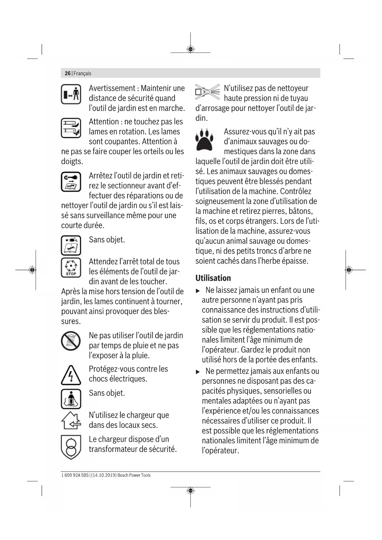 distance de sécurité quand l’outil de jardin est en marche. Attention: ne touchez pas les lames en rotation. Les lames sont coupantes. Attention à ne pas se faire couper les orteils ou les doigts. Arrêtez l’outil de jardin et reti- rez le sectionneur avant d’ef- fectuer des réparations ou de nettoyer l’outil de jardin ou s’il est lais- sé sans surveillance même pour une courte durée. Sans objet. Attendez l’arrêt total de tous les éléments de l’outil de jar- din avant de les toucher. Après la mise hors tension de l’outil de jardin, les lames continuent à tourner, pouvant ainsi provoquer des bles- sures. Ne pas utiliser l’outil de jardin par temps de pluie et ne pas l’exposer à la pluie. Protégez-vous contre les chocs électriques. Sans objet. N’utilisez le chargeur que dans des locaux secs. Le chargeur dispose d’un transformateur de sécurité. N’utilisez pas de nettoyeur haute pression ni de tuyau d’arrosage pour nettoyer l’outil de jar- din. Assurez-vous qu’il n’y ait pas d’animaux sauvages ou do- mestiques dans la zone dans laquelle l’outil de jardin doit être utili- sé. Les animaux sauvages ou domes- tiques peuvent être blessés pendant l’utilisation de la machine. Contrôlez soigneusement la zone d’utilisation de la machine et retirez pierres, bâtons, fils, os et corps étrangers. Lors de l’uti- lisation de la machine, assurez-vous qu’aucun animal sauvage ou domes- tique, ni des petits troncs d’arbre ne soient cachés dans l’herbe épaisse. Utilisation u Ne laissez jamais un enfant ou une autre personne n’ayant pas pris connaissance des instructions d’utili- sation se servir du produit. Il est pos- sible que les réglementations natio- nales limitent l’âge minimum de l’opérateur. Gardez le produit non utilisé hors de la portée des enfants. u Ne permettez jamais aux enfants ou personnes ne disposant pas des ca- pacités physiques, sensorielles ou mentales adaptées ou n’ayant pas l’expérience et/ou les connaissances nécessaires d’utiliser ce produit. Il est possible que les réglementations nationales limitent l’âge minimum de l’opérateur. 1 609 92A 5BS | (14.10.2019) Bosch Power ToolsFrançais | 27 u Les enfants doivent être surveillés pour s’assurer qu’ils ne jouent pas avec le produit. u N’utilisez jamais l’outil de jardin lorsque des personnes, en particu- lier des enfants ou des animaux do- mestiques, se trouvent à proximité. u L’utilisateur de la tondeuse est res- ponsable des accidents et des dom- mages causés à autrui ou à leurs biens. u Ne portez pas de chaussures en ca- outchouc ouverts ou des sandalettes quand vous utilisez le produit. Portez toujours des chaussures fermées et des pantalons longs. u Inspectez soigneusement la surface à travailler et éliminez pierres, bâ- tons, fils métalliques, os et autres corps étrangers. u Avant de mettre l’appareil en marche, contrôlez toujours si les lames, les vis des lames et le sous- groupe de coupage ne sont pas usés ou endommagés. Remplacez les lames usées ou endommagées tou- jours en même temps que les vis des lames pour éviter tout balourd. u Ne tondez que de jour ou sous un bon éclairage artificiel. u Ne travaillez pas avec la tondeuse à gazon dans des conditions météoro- logiques défavorables et plus parti- culièrement en cas d’approche d’orage. u Si possible, n’utilisez pas l’outil de jardin lorsque l’herbe est mouillée. u Ne menez l’appareil qu’au pas, ne ja- mais courir. u N’utilisez jamais l’outil de jardin quand les équipements de sécurité sont défectueux, sans carter ou sans équipements de protection tels que par exemple le pare-chocs et/ou le bac de ramassage. u Pour votre propre protection, nous vous recommandons de porter une protection acoustique. u N’utilisez pas le produit si vous êtes fatigué ou sous l’emprise de drogues, d’alcool ou de médica- ments. u Travailler sur des talus peut être dan- gereux: – Ne tondez pas des pentes très abruptes. – Sur des pentes ou de l’herbe mouillée, faites attention à ne pas perdre l’équilibre. – Tondez toujours perpendiculaire- ment à la pente, jamais de haut en bas ou de bas en haut. – Faites très attention lors d’un changement de direction sur une pente. u Faites très attention en reculant ou en tirant l’outil de jardin vers vous. u Lors des travaux de tonte, poussez l’outil de jardin toujours vers l’avant et ne le tirez jamais vers vous. u Les lames doivent être totalement à l’arrêt quand vous devez incliner l’ou- til de jardin pour le transporter, quand vous traversez des surfaces Bosch Power Tools 1 609 92A 5BS | (14.10.2019)28 | Français autres que le gazon ou quand vous transportez l’outil de jardin entre deux surfaces à tondre. u N’inclinez pas l’outil de jardin lors du démarrage ou lorsque vous mettez le moteur en marche. u Mettez l’outil de jardin en marche conformément aux instructions du mode d’emploi et veillez à maintenir les pieds largement à l’écart des par- ties en rotation. u Tenez les pieds et les mains éloignés des parties rotatives de l’outil de jar- din. u Gardez une distance suffisante par rapport à la zone d’éjection lorsque vous travaillez avec l’outil de jardin. u Ne soulevez ni transportez jamais l’outil de jardin pendant que le mo- teur est en marche. u Faites attention lors du stockage à ce que les 4 roues de l’outil de jardin soient au sol. u Ne soulevez l’outil de jardin que par la poignée. Maniez la poignée avec prudence. u N’effectuez aucune modification sur la poignée. Des modifications non autorisées peuvent s’avérer pré- judiciables à la sécurité de votre ap- pareil et entraînent une augmenta- tion du niveau sonore et des vibra- tions ainsi qu’une réduction de la puissance. Ramasser les feuilles La lame est formée de sorte à pouvoir ramasser les feuilles d’automne de votre jardin. Pour obteni