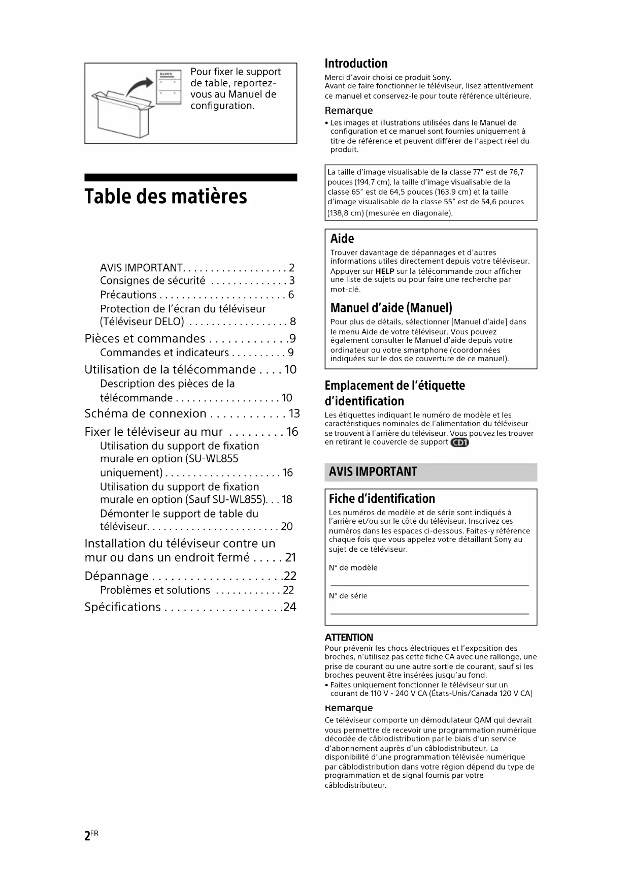 - Les images et illustrations utilisées dans le Manuel de configuration et ce manuel sont fournies uniquement à titre de référence et peuvent différer de l’aspect réel du produit. Emplacement de l’étiquette d’identification Les étiquettes indiquant le numéro de modèle et les caractéristiques nominales de l’alimentation du téléviseur se trouvent à l’arrière du téléviseur. Vous pouvez les trouver en retirant le couvercle de support . ATTENTION Pour prévenir les chocs électriques et l’exposition des broches, n’utilisez pas cette fiche CA avec une rallonge, une prise de courant ou une autre sortie de courant, sauf si les broches peuvent être insérées jusqu’au fond.• Faites uniquement fonctionner le téléviseur sur un urant de 110 V - 240 V CA (États-Unis/Canada 120 V CA) Remarque Remarque Ce téléviseur comporte un démodulateur QAM qui devrait vous permettre de recevoir une programmation numérique décodée de câblodistribution par le biais d’un service d’abonnement auprès d’un câblodistributeur. La disponibilité d’une programmation télévisée numérique par câblodistribution dans votre région dépend du type de programmation et de signal fournis par votre câblodistributeur. Pour fixer le support de table, reportez- vous au Manuel de configuration. La taille d’image visualisable de la classe 77” est de 76,7 pouces (194,7 cm), la taille d’image visualisable de la classe 65” est de 64,5 pouces (163,9 cm) et la taille d’image visualisable de la classe 55” est de 54,6 pouces (138,8 cm) (mesurée en diagonale). Aide Trouver davantage de dépannages et d’autres informations utiles directement depuis votre téléviseur. Appuyer sur HELP sur la télécommande pour afficher une liste de sujets ou pour faire une recherche par mot-clé. Manuel d’aide (Manuel) Pour plus de détails, sélectionner [Manuel d'aide] dans le menu Aide de votre téléviseur. Vous pouvez également consulter le Manuel d’aide depuis votre ordinateur ou votre smartphone (coordonnées indiquées sur le dos de couverture de ce manuel). AVIS IMPORTANT Fiche d’identification Les numéros de modèle et de série sont indiqués à l’arrière et/ou sur le côté du téléviseur. Inscrivez ces numéros dans les espaces ci-dessous. Faites-y référence chaque fois que vous appelez votre détaillant Sony au sujet de ce téléviseur.N° de modèleN° de série3